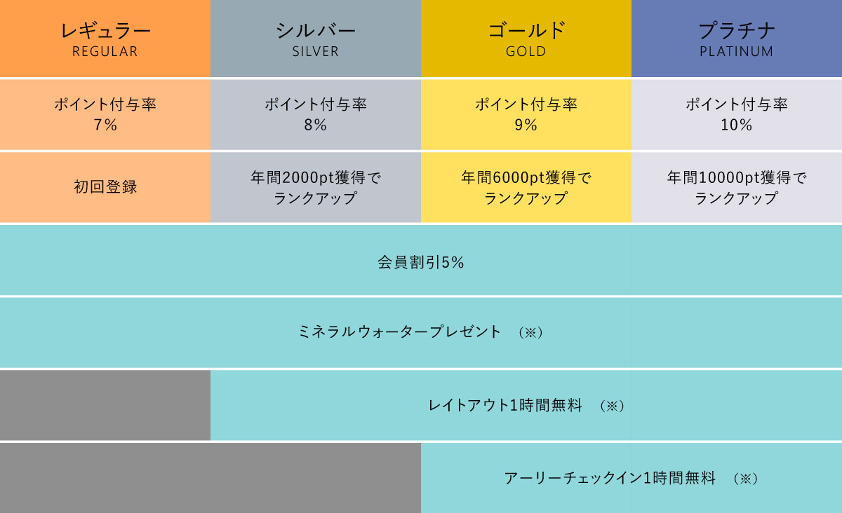 ※シルバー会員以上はレイトアウト1時間無料、ゴールド会員以上はアーリーチェックイン1時間無料となります。 -
