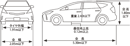収容車制限寸法で駐車できる車両は、積載物、取付物を含めて以下のとおりです。