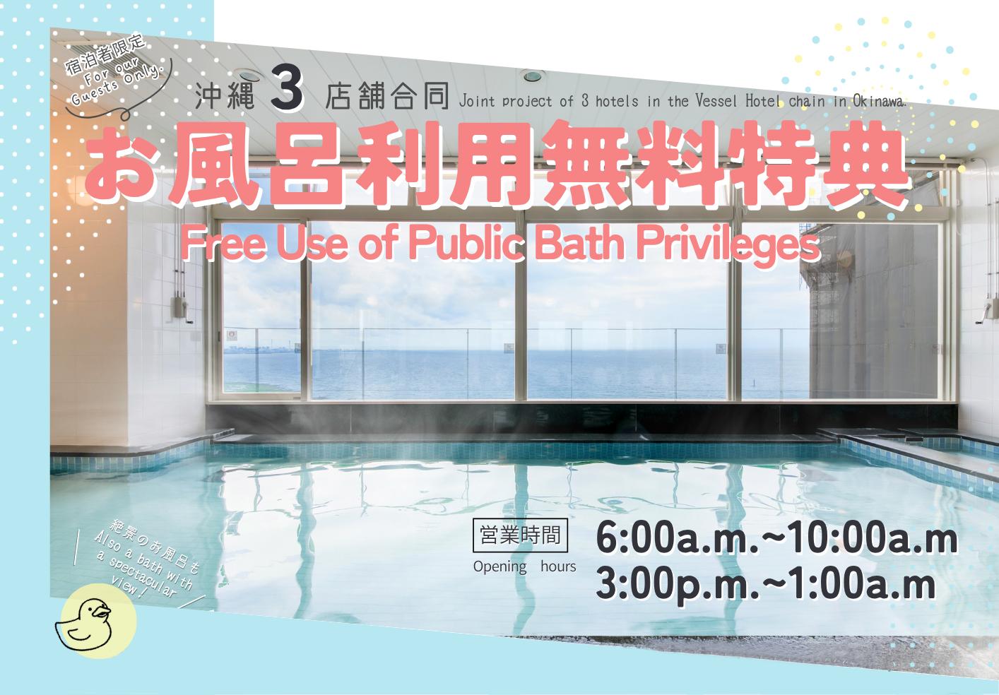 いつもベッセルホテルカンパーナ沖縄をご利用いただき、ありがとうございます。 この度、当ホテルの沖縄のグループホテル 3ホテルにて、お風呂利用...