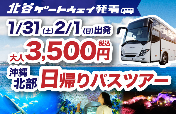 北谷ゲートウェイ(ホテルから北谷ゲートウェイまでは徒歩約8分)を発着とする日帰りバスツアーのご案内です。 1/31(土) 2/1(日)出発の...