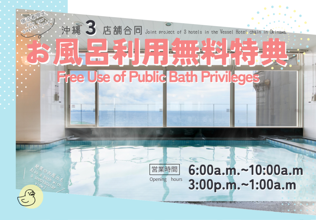 この度、当ホテルの沖縄のグループホテル 3ホテルにて、お風呂利用無料特典を、実施しております。