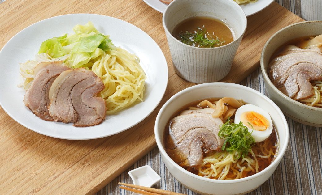 まず、器に麺を盛り付けたら、麺の上にゆで野菜、刻み葱、ゆで卵、チャーシュー、メンマなどお好きなトッピングをのせます。つけ麺は別の器にスープを入れて、尾道ラーメンはスープをかけたら出来上がりです。