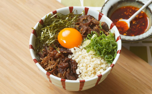ご飯をよそったら、牛肉煮、天かす、もろみ味噌、刻みのりをのせて真ん中に卵をのせ、食べるラー油をかけて食べる「へそ丼」。
