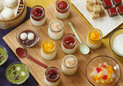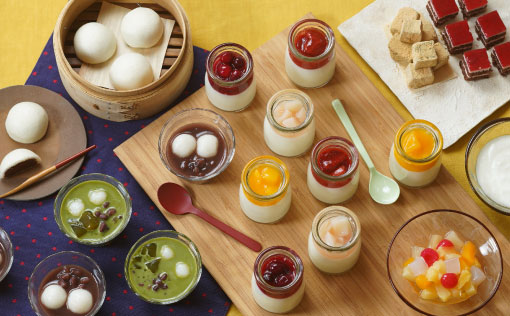 あったかい酒蒸しまんじゅうや、麹と小豆のおしるこ、「新庄みそ」を使った杏仁豆腐など、東広島らしさを感じるオリジナルスイーツをお楽しみください。