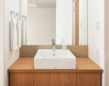 独立洗面化粧台 浴室と洗面化粧台が分かれているので、ご家族でご利用の際も混み合わずご使用いただけます。