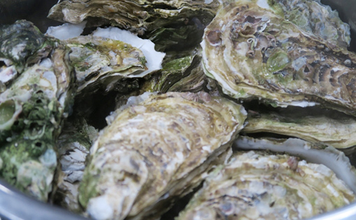 蓑島・稲童の沖約4キロの海上で養殖されるカキは河川から栄養分の多い植物性プランクトンが流れ込むため、成長が早く、大粒で味がよいと評判です。