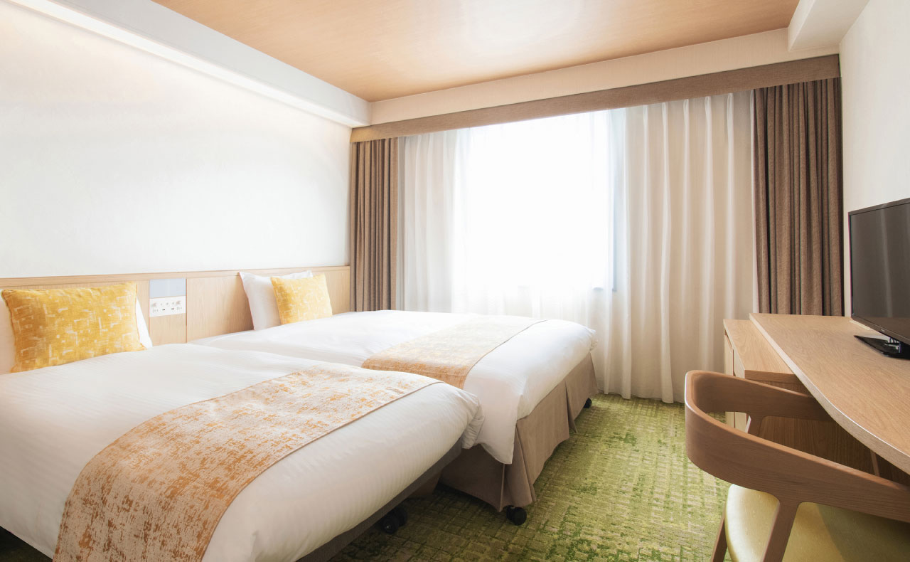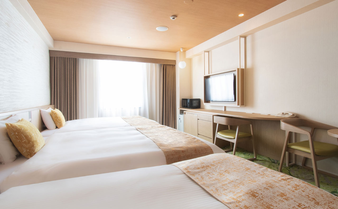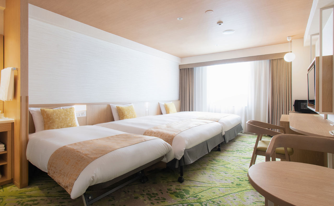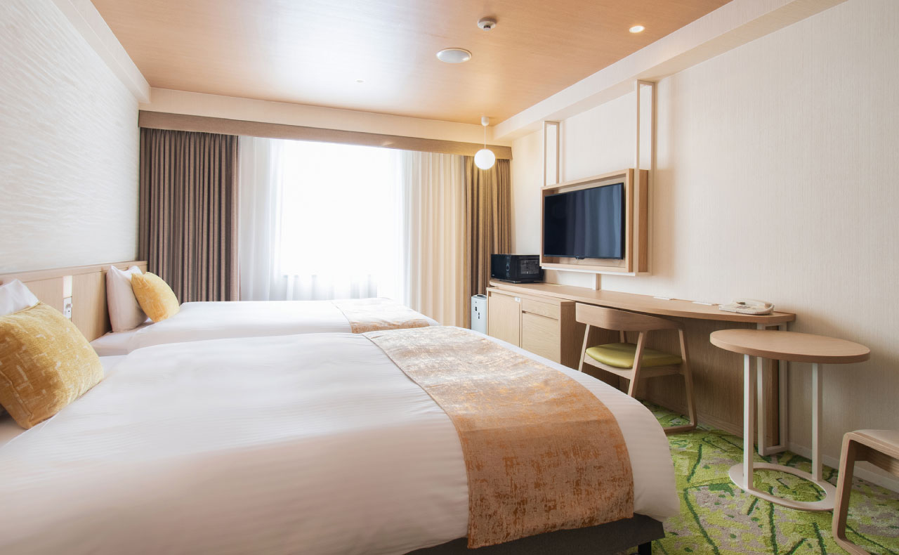 改装したお部屋です。150cm幅ベッドのツインルームです。客室は26㎡でゆったりとした広さで、ご家族での宿泊も余裕です。