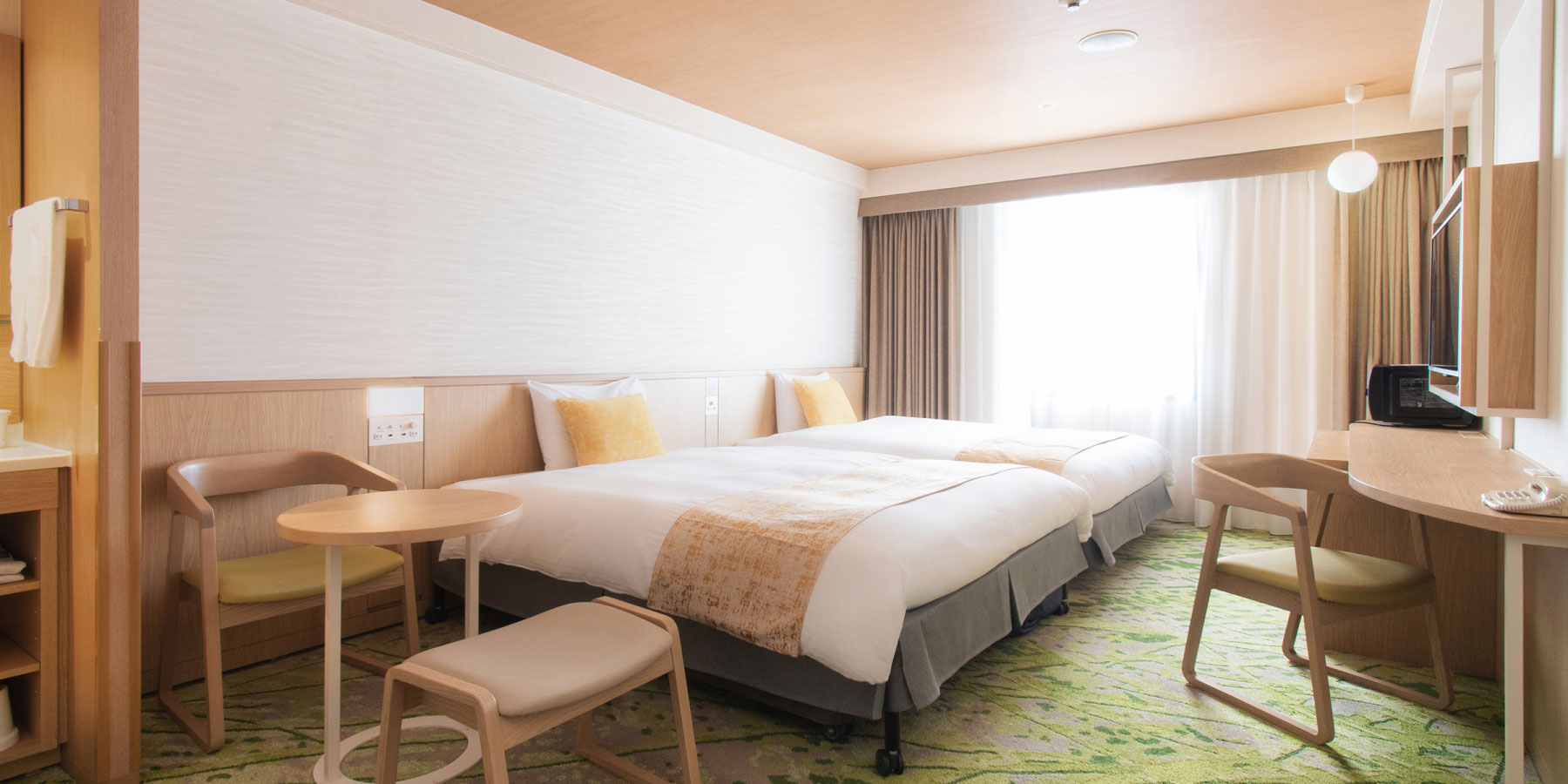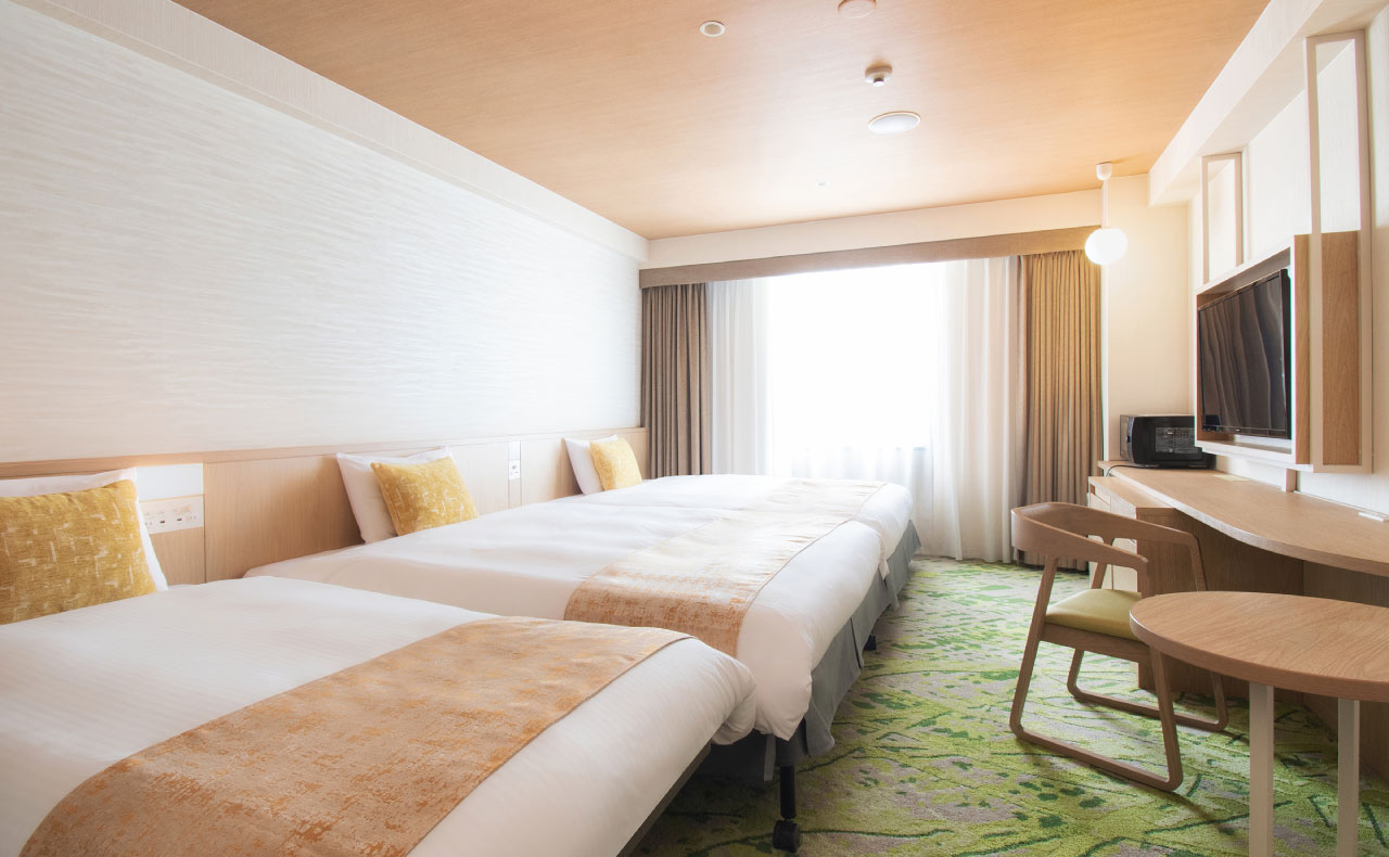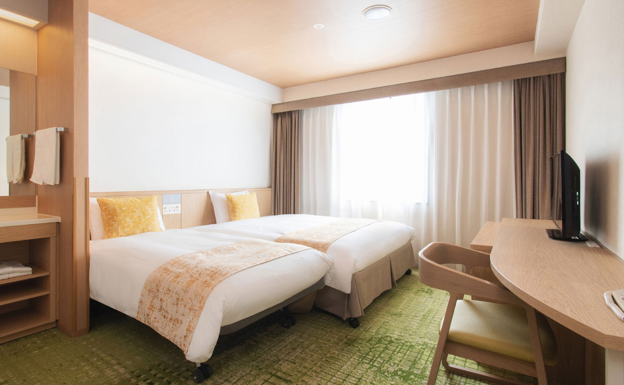 改装したお部屋です。150cm幅ベッドのツインルームです。客室は26㎡でゆったりとした広さで、ご家族での宿泊も余裕です。