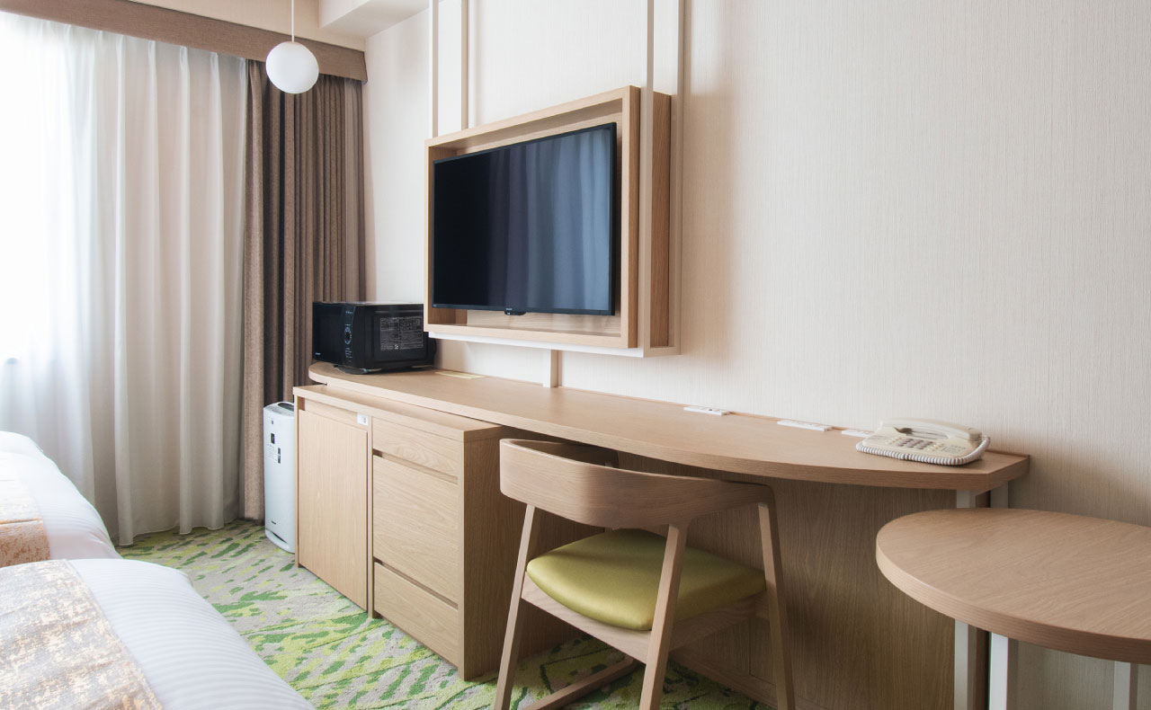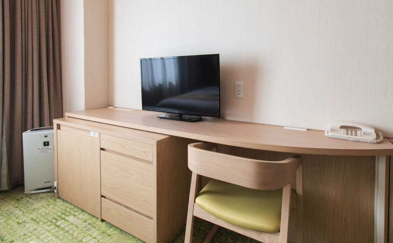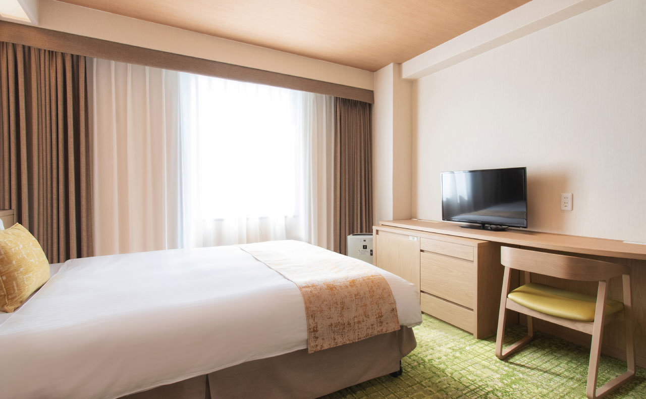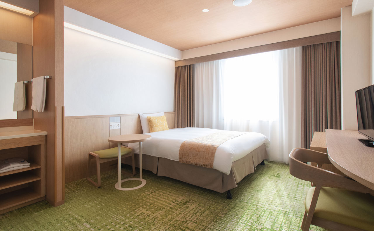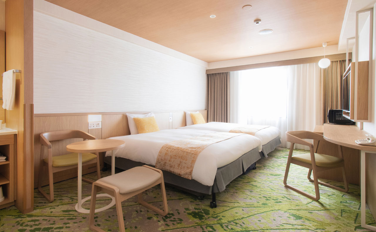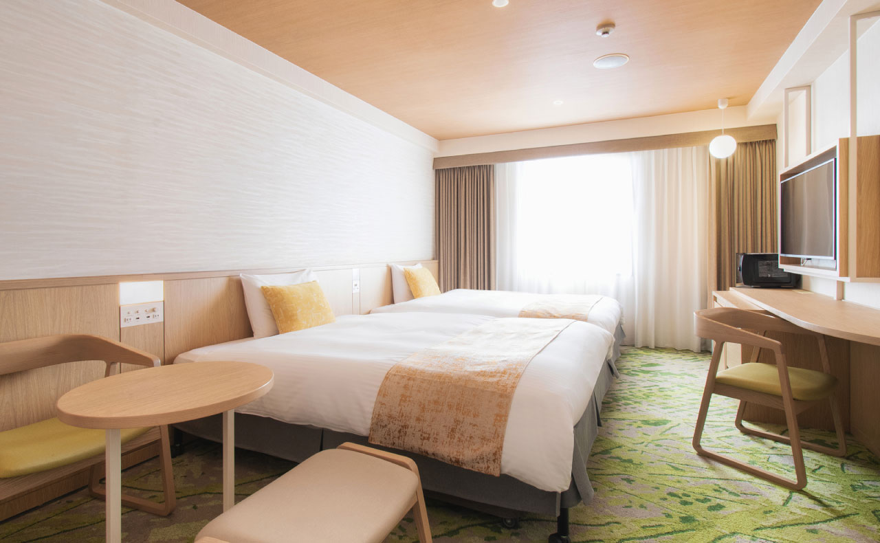 全室ベッド幅150cmのゆとりサイズを完備。客室はビジネスでもご家族でも満足の広さ。お部屋では靴を脱いで素足でくつろげます。