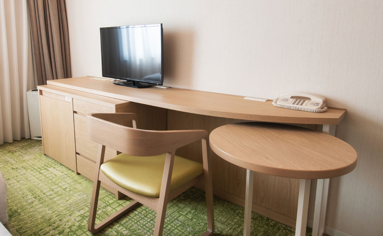 デスクで新聞を広げたり、仕事をしたり。幅があるからこそ、使いやすいワイドデスクを全室完備。