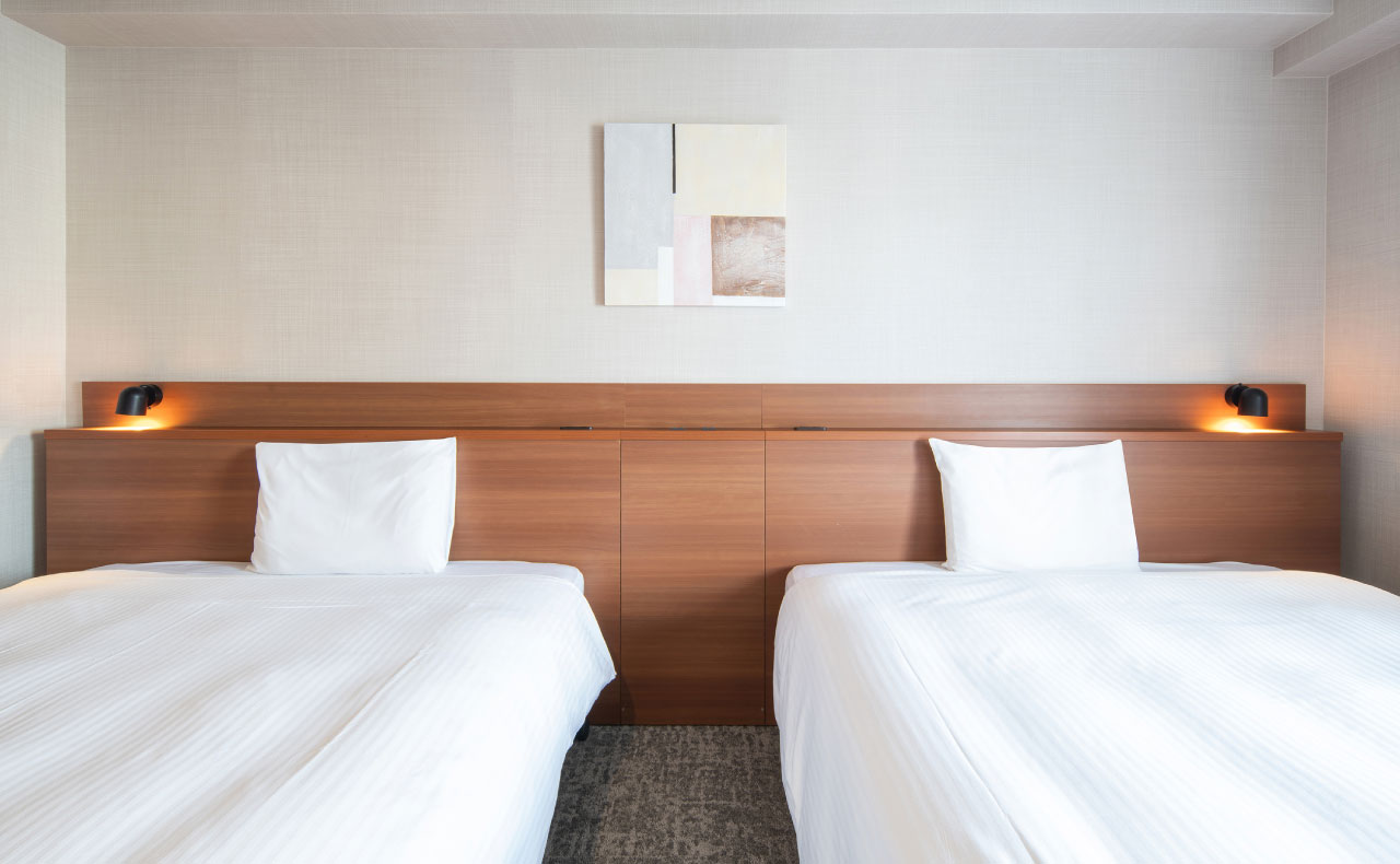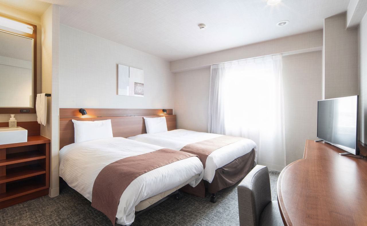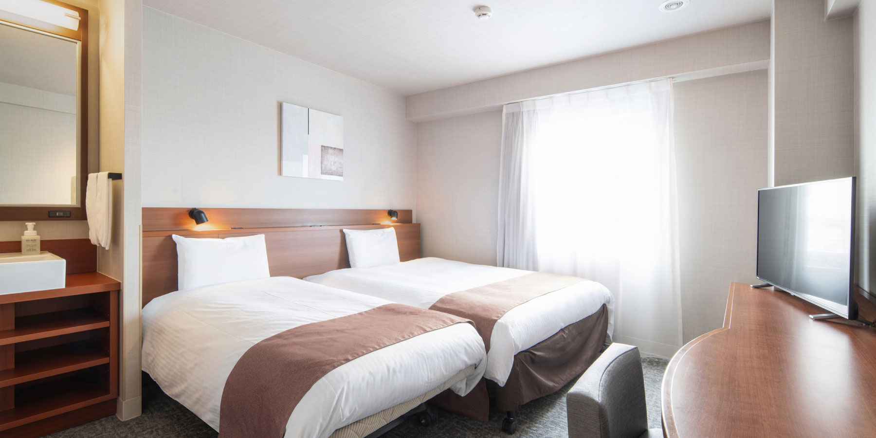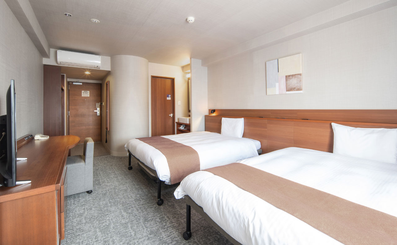 150cm幅ベッドのツインルームです。客室は26㎡でゆったりとした広さで、ご家族での宿泊も余裕です。