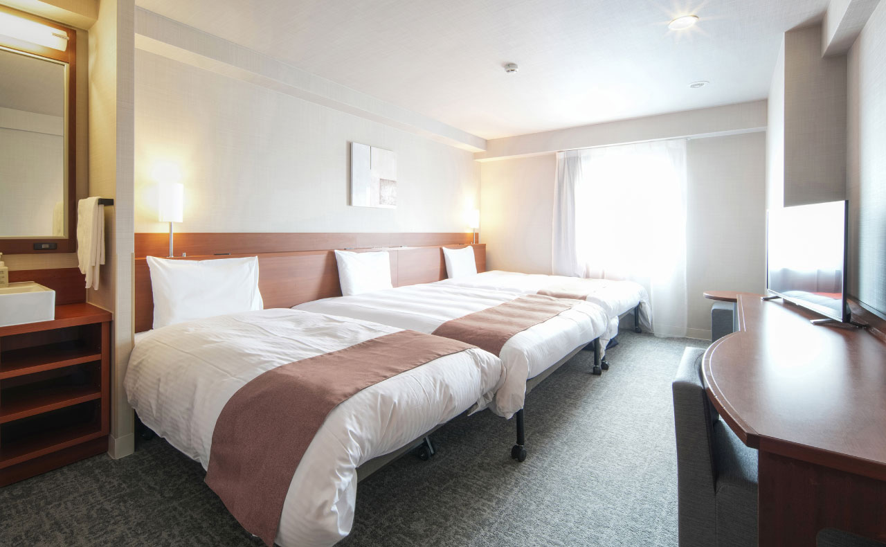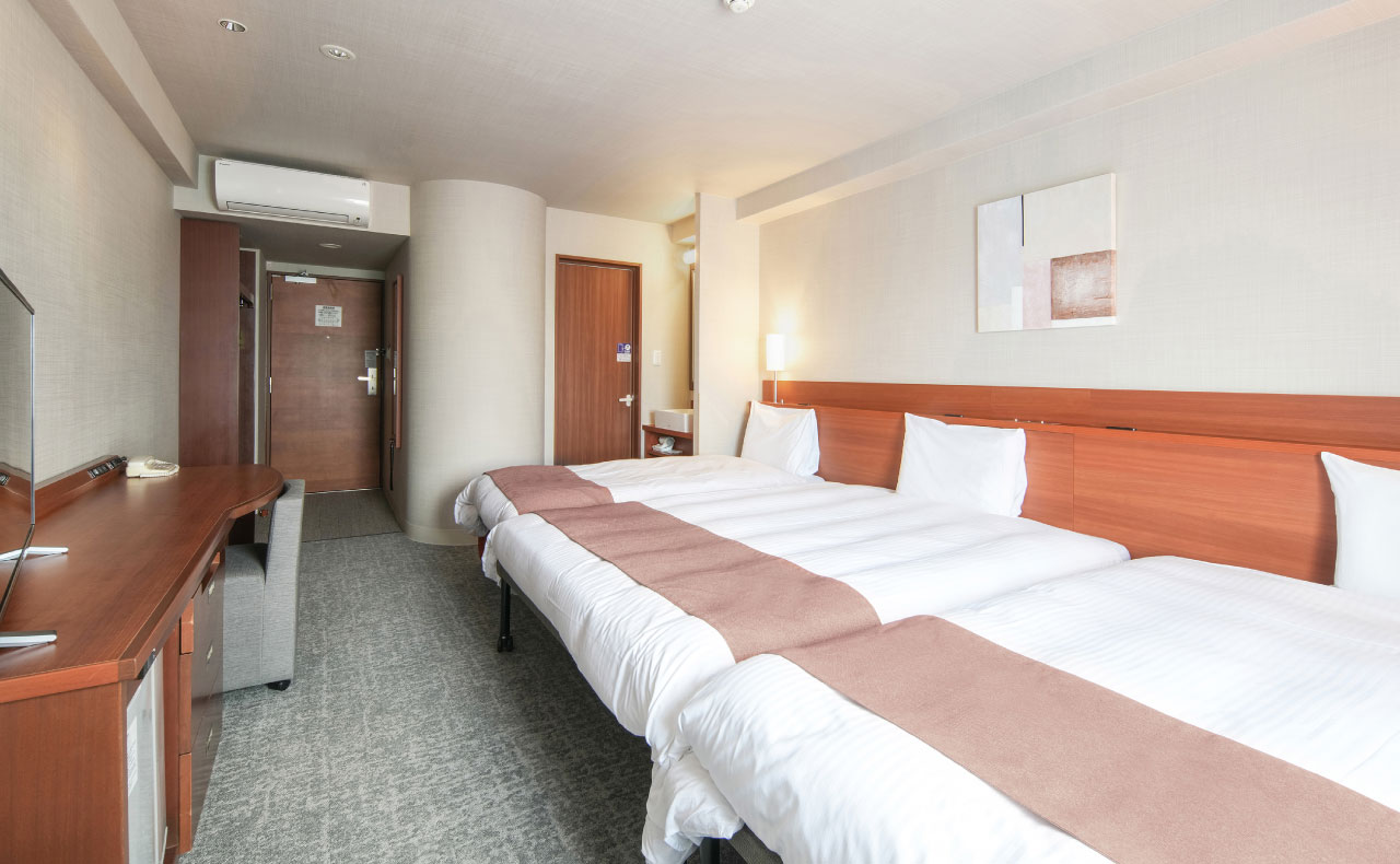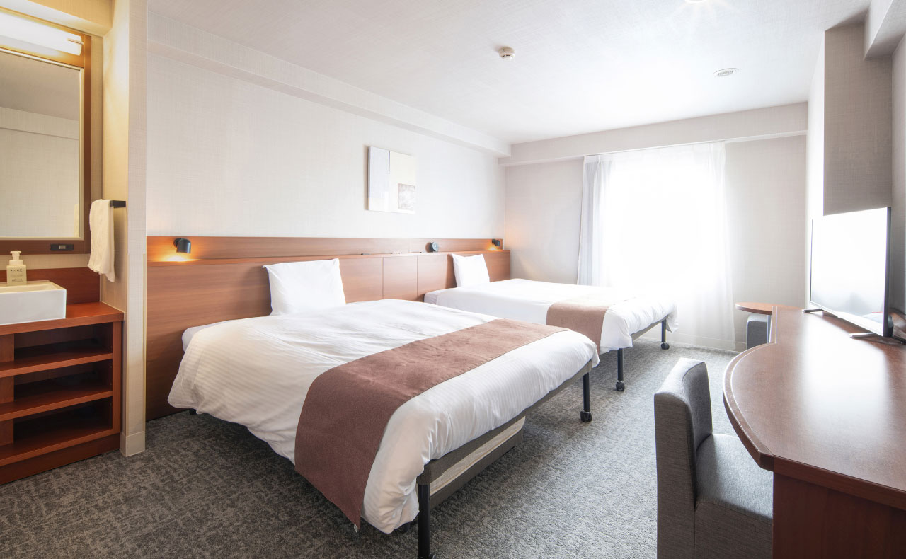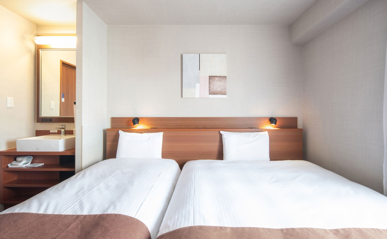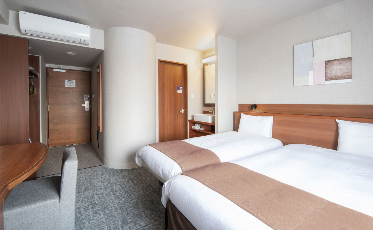 150cm幅ベッドのツインルームです。客室は26㎡でゆったりとした広さで、ご家族での宿泊も余裕です。