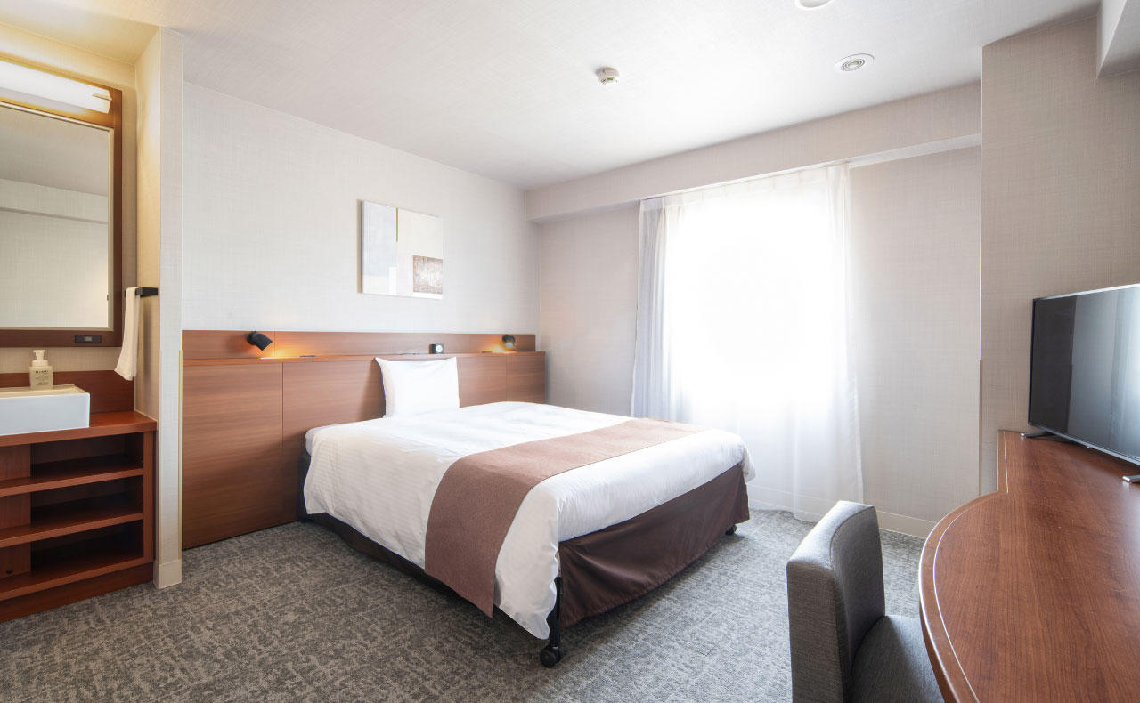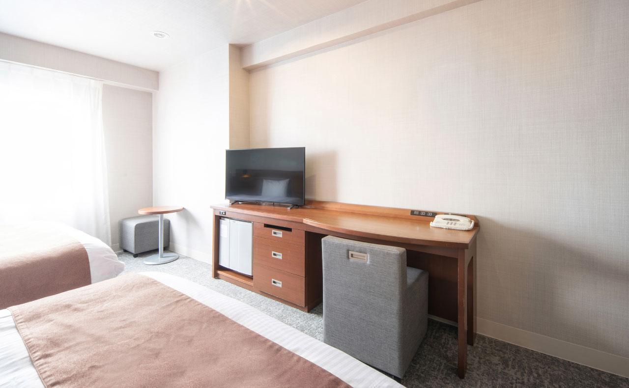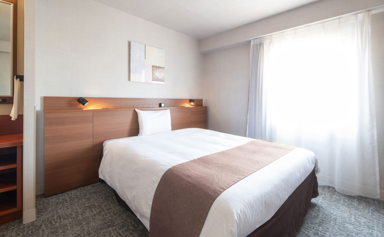 全室ベッド幅150cmのゆとりサイズを完備。客室はビジネスでもご家族でも満足の広さ。お部屋では靴を脱いで素足でくつろげます。