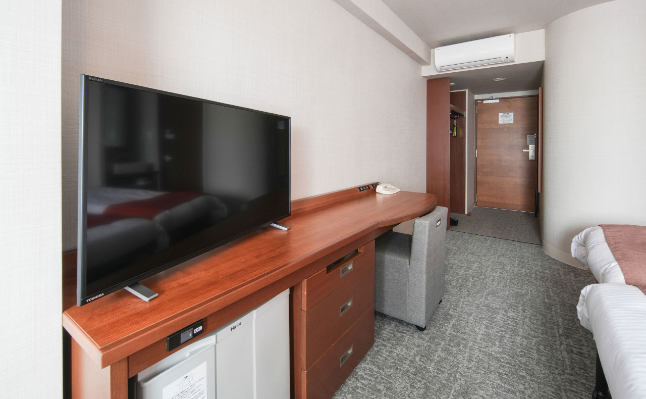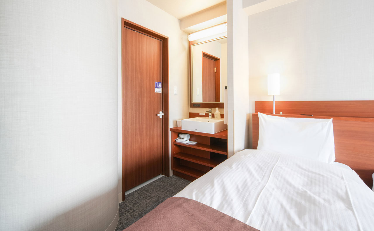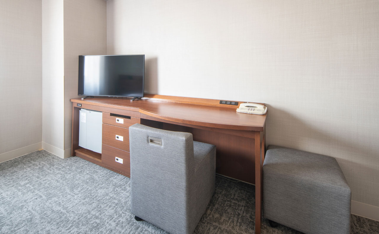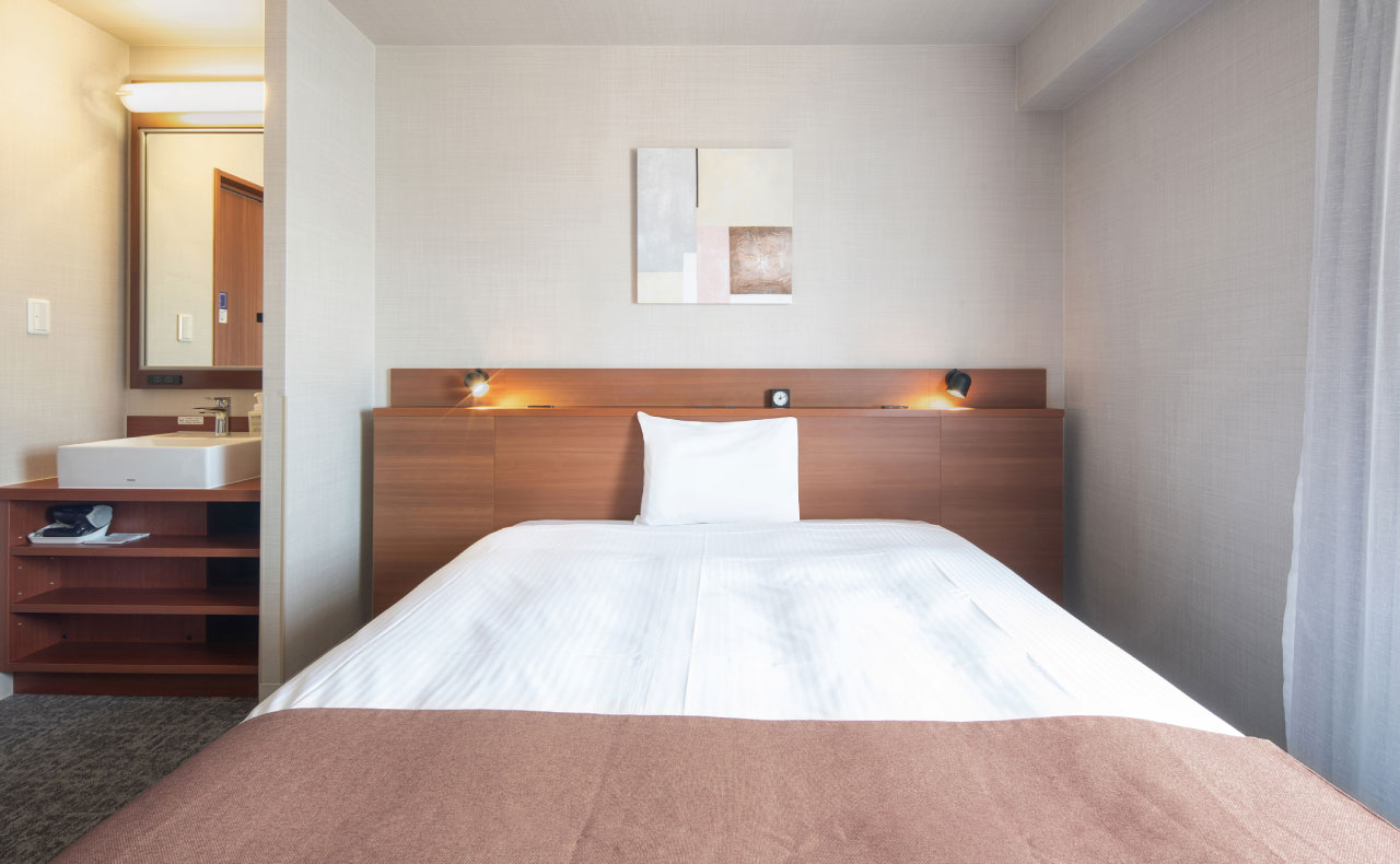 全室ベッド幅150cmのゆとりサイズを完備。客室はビジネスでもご家族でも満足の広さ。お部屋では靴を脱いで素足でくつろげます。