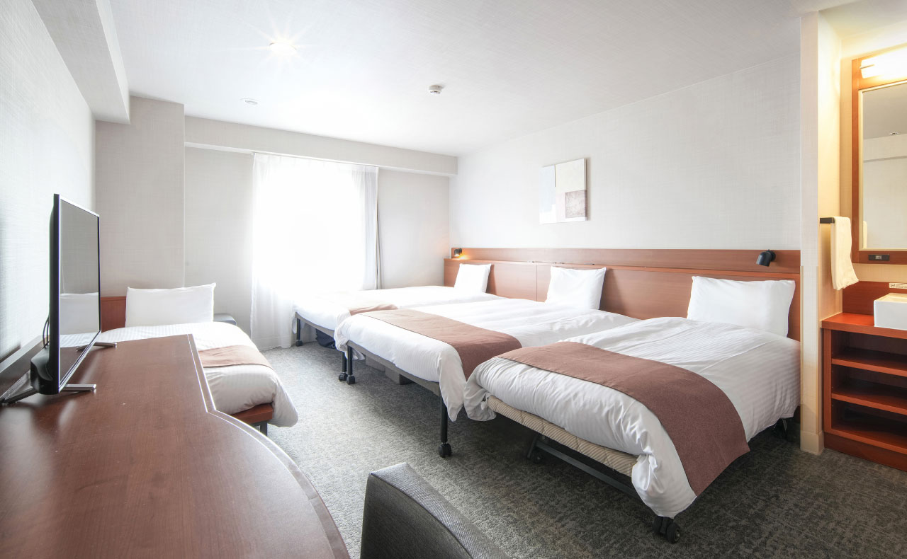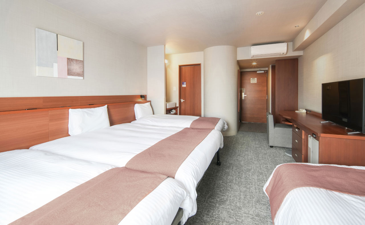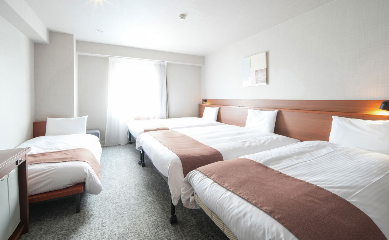 150cm幅のベッドと、90cm幅のベッドが1台設置の客室。2~3名宿泊に余裕の広さです。