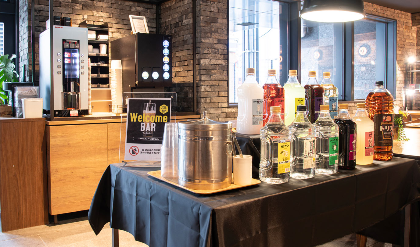 ご宿泊のお客様には1Fラウンジ・ロビーにてウェルカムサービスを無料でご用意しております。お部屋にあがられる前におくつろぎいただいたり、客室にお持ちいただくことも可能です。