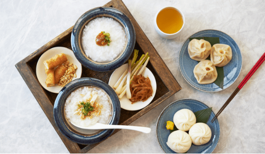 Lequオリジナルバーガーをはじめ、沖縄料理や人気の中華がゆなど、おおきなキッチンのような会場で、みんなで楽しく作って食べる朝ごはん。