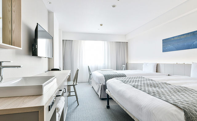 全室150cm幅のベッド完備で、ゆったりとした客室。洗面化粧台・バス・トイレがそれぞれ独立しており、快適にお過ごしいただけます。