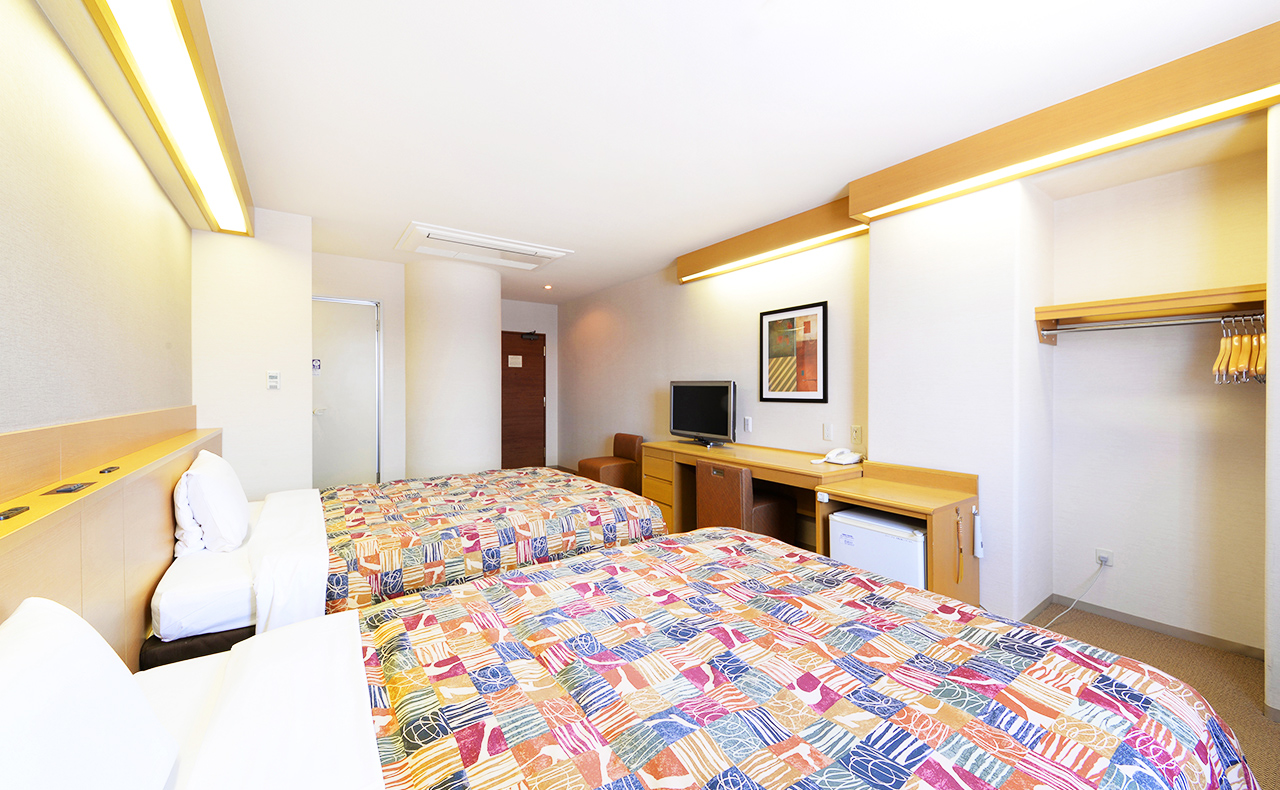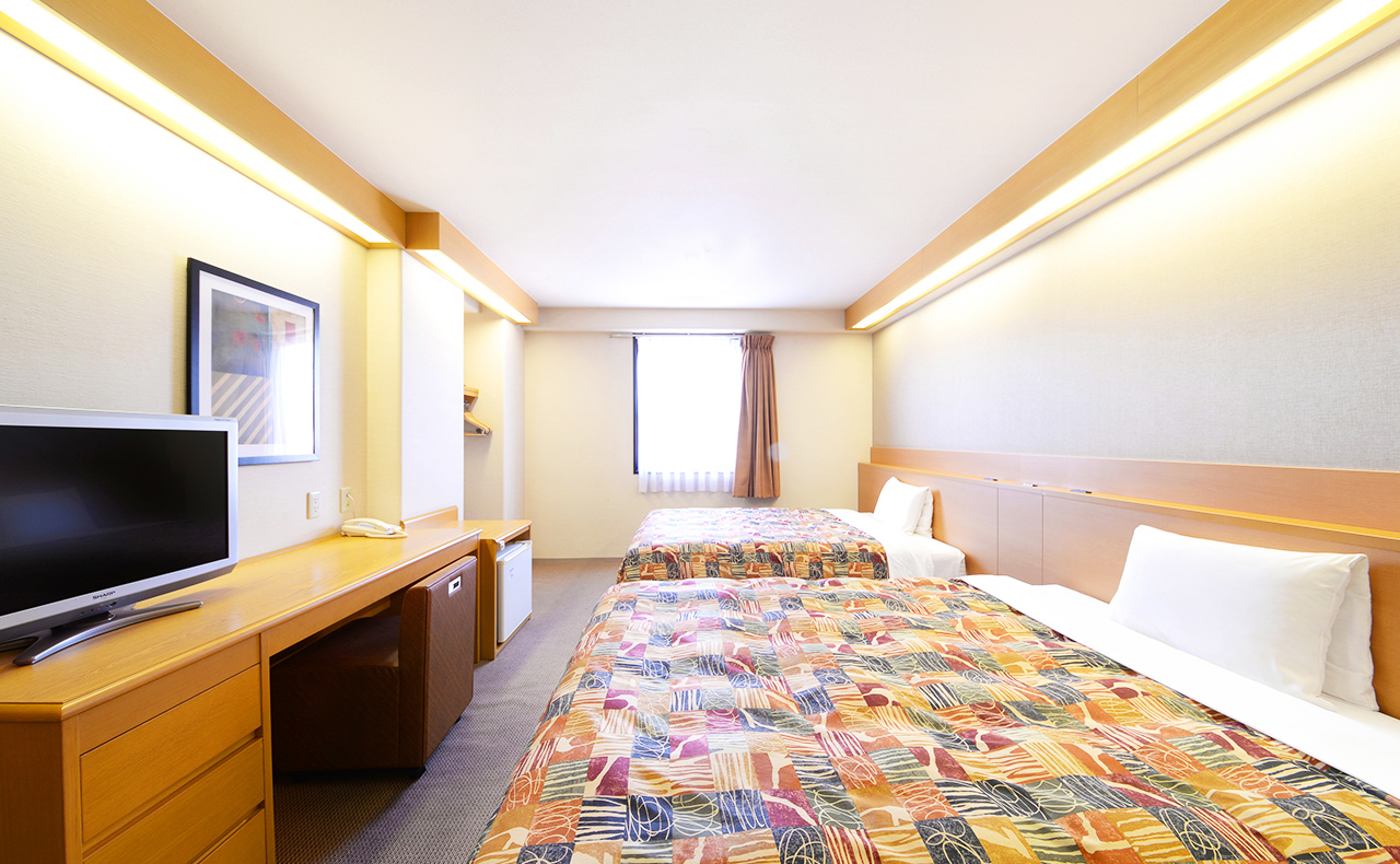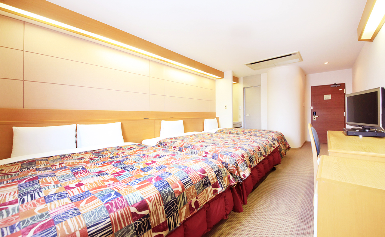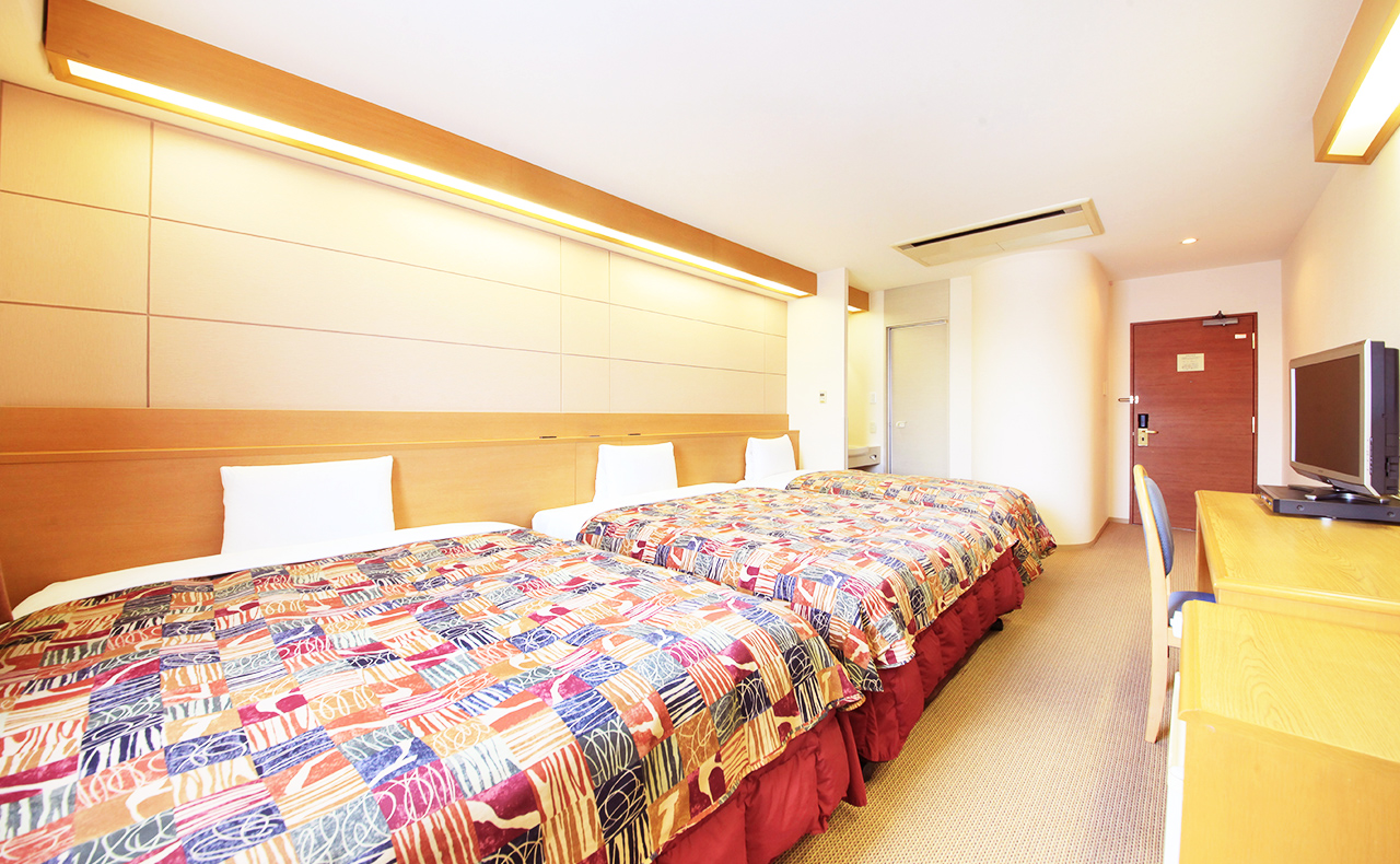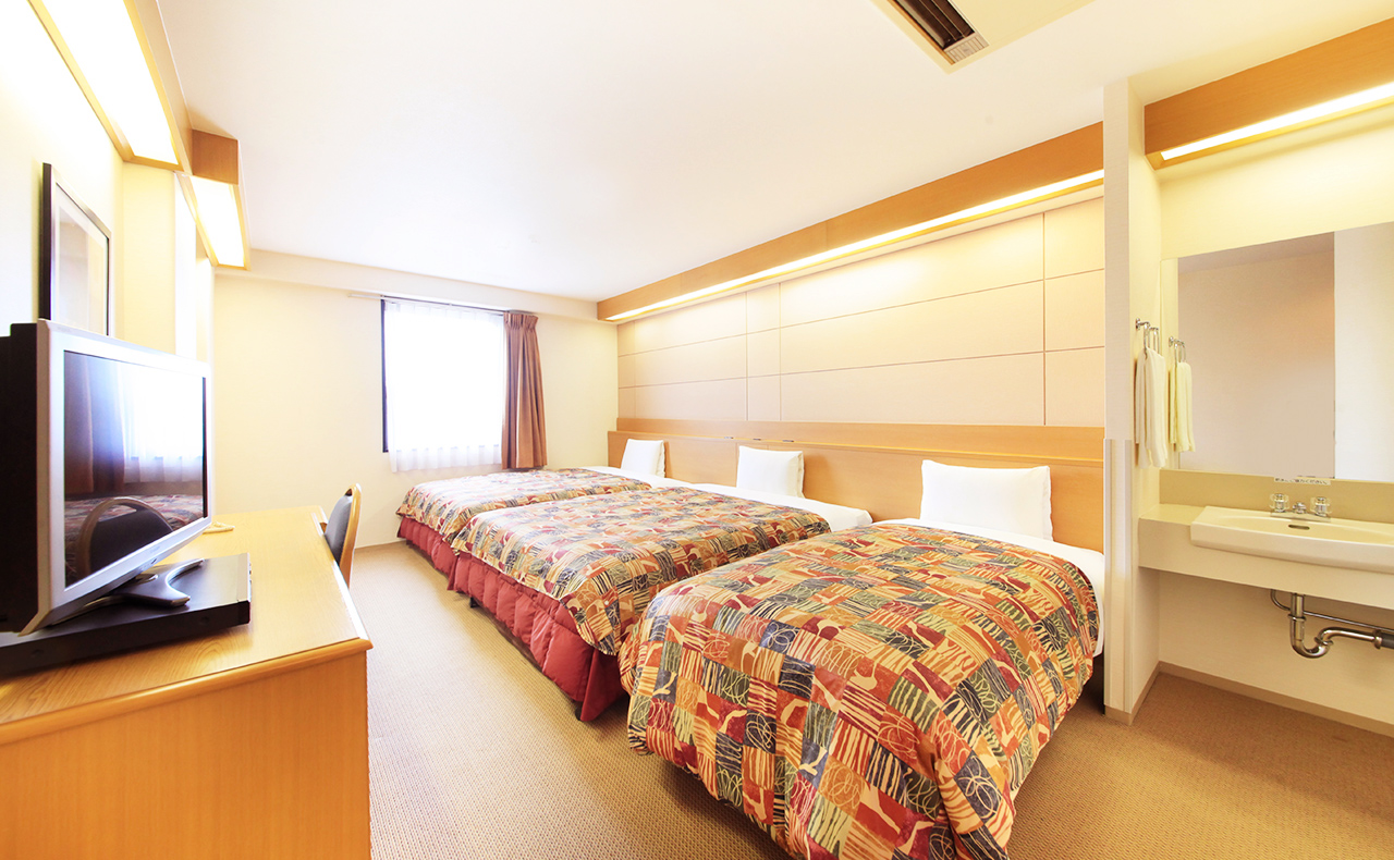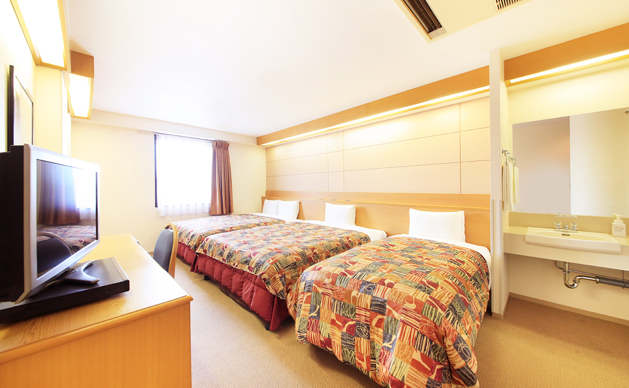 150cm幅のベッドが2台と、90cm幅のベッドが1台のトリプルルームです。洗面化粧台・バス・トイレがそれぞれ独立しており、快適にお過ごしいただけます。