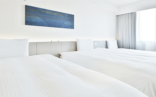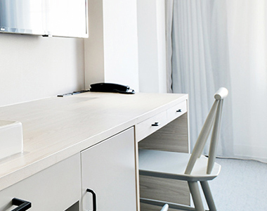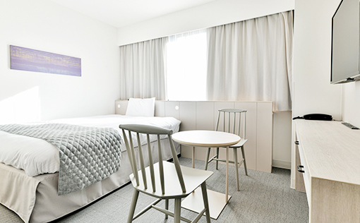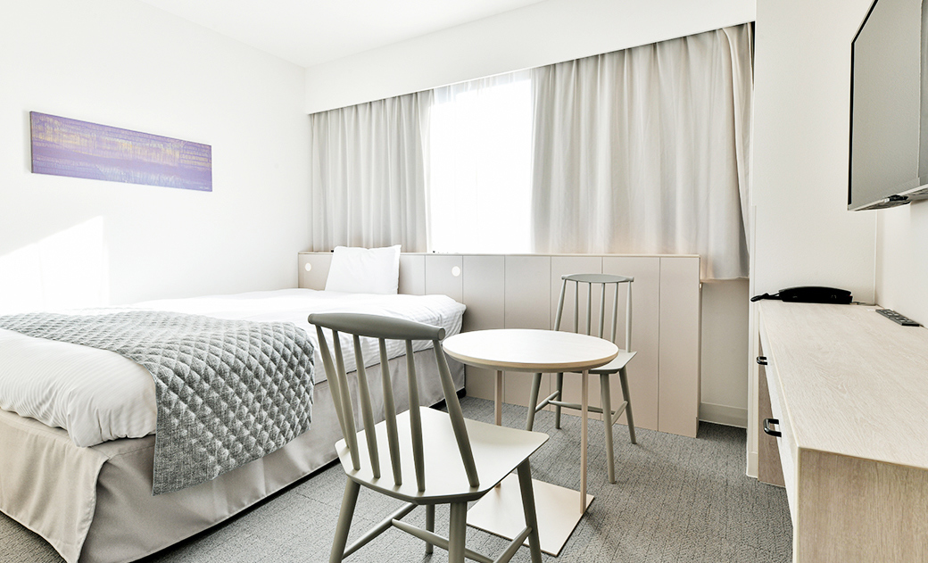 一般的なビジネスホテルの約1.5倍広さの部屋に、幅150㎝のベッドでゆったりくつろげます。また、全室Wi-Fiと有線LANで、高速インターネットが無料で楽しめます。新聞や書類を広げてもまだ余裕があるほどのワイドデスクも全室設置。