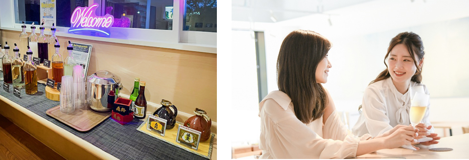 メニューには、日本酒やウイスキー、カクテルなど12種類のお酒をご用意。中でも銘醸地として知られる東広島市西条の西条酒蔵通りにある酒蔵からセレクトした「亀齢(きれい)」「福美人」はおすすめです。新たに開始したアルコールドリンクに加え、すでにご好評いただいているソフトドリンクのウェルカムサービスも併せてご利用いただけます。宿泊のお客様は、お好きな割り方でオリジナルドリンクをセルフでお楽しみいただけます。