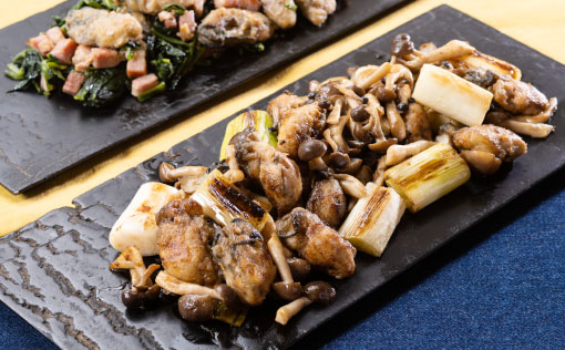 広島県産の牡蠣をバターと一緒に鉄板でジュジュっと焼き上げます。ほうれん草がマッチするバター焼き牡蠣とほうれん草の鉄板焼きもご用意しております。アツアツをどうぞ。