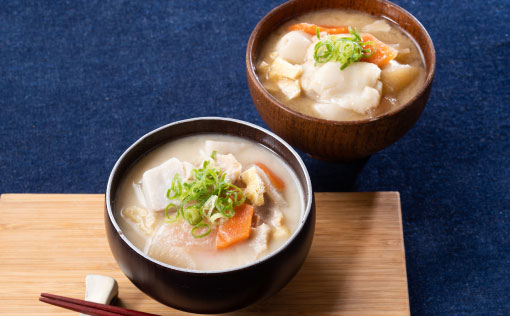 made in 広島の代表的の味噌の一つ、ますや味噌。麹とますや味噌を使った粕汁や、ますや味噌を使った団子汁などほっこり美味しい具だくさんの味噌汁を日替わりでご用意しております。