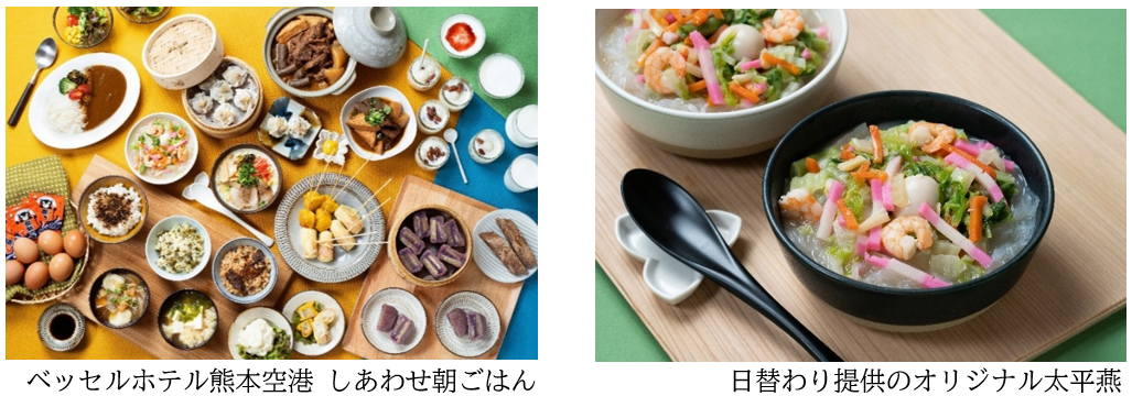 ベッセルホテル熊本空港オリジナルの「太平燕(タイピーエン)」(日替わり)をはじめ、いきなり団子、からし蓮根などご当地グルメが目白押しです。朝から元気になること間違いなしのメニューが盛りだくさんのしあわせ朝ごはんです。