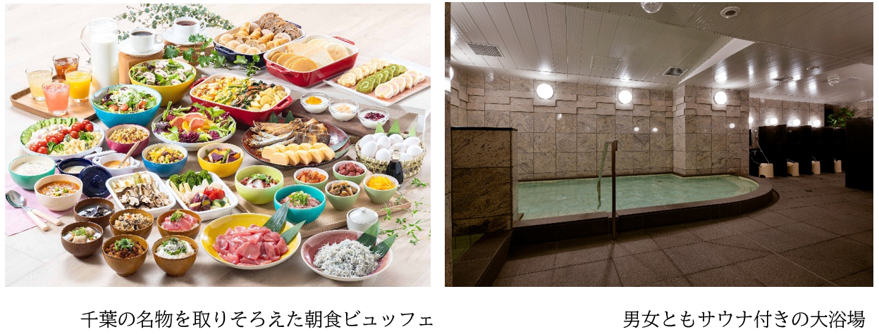 JR「千葉駅」から徒歩4分でアクセス良好です。館内には、男女ともにサウナ付きの大浴場を完備、旅の疲れを癒せます。自慢の朝食は、「ENJOY COLOFUL!あさ千葉ごはん」をコンセプトに、ビジネスの朝も休日の朝もエンジョイ!カラフルな千葉の朝ごはんでパワーをしっかりチャージして、ハッピーな1日のはじまりをサポートします。マグロやしらすをご飯にのせたオリジナル丼や富津名物「はかりめ(穴子)丼」に、千葉の郷土料理イワシを使ったお味噌汁や銚子産のサバの干物など、ベッセルイン千葉駅前のオリジナルメニューも多数ご用意。また彩り豊かなフレッシュ野菜はもちろん、甘みが引き立つグリル&スチーム野菜もお楽しみいただけます。