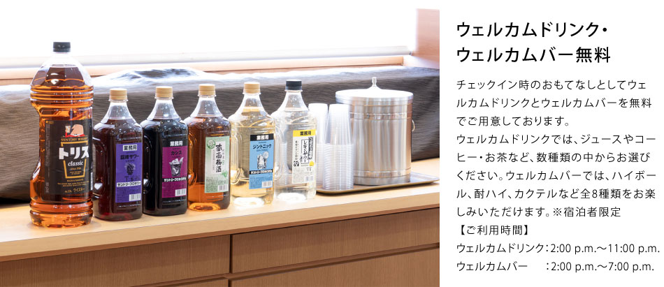 女性にはメイク落とし・化粧水・ヘアパックなどをご用意しております。荷物の多くなりがちな旅行にうれしいサービスです。