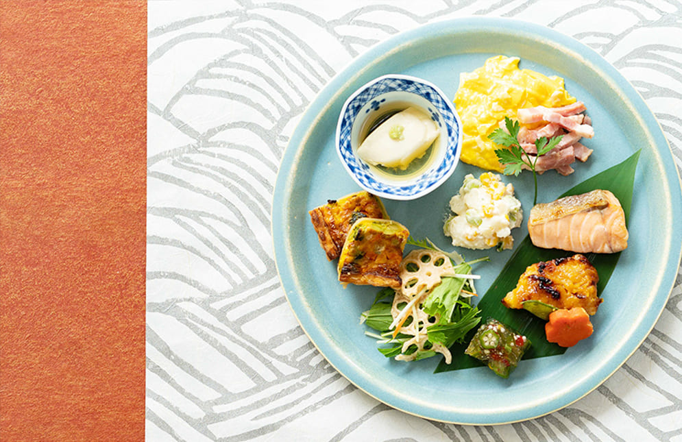 地元の食材をふんだんに使用した朝食をビュッフェスタイルでご用意。おばんざいをはじめ、老舗の小川珈琲や洋食パンまで、和洋どちらも味わえます。和のいいところ・洋のいいところのいいとこどりでおもてなし。少し贅沢でリラックスした旅の朝ごはんをお楽しみいただけます。