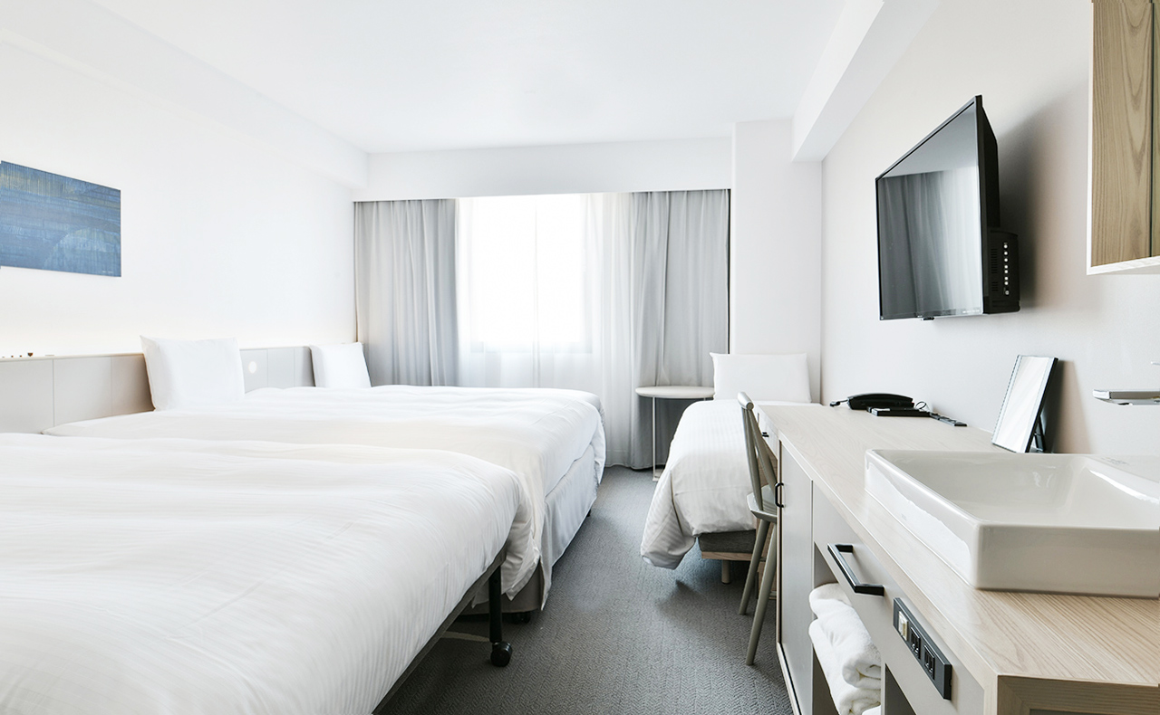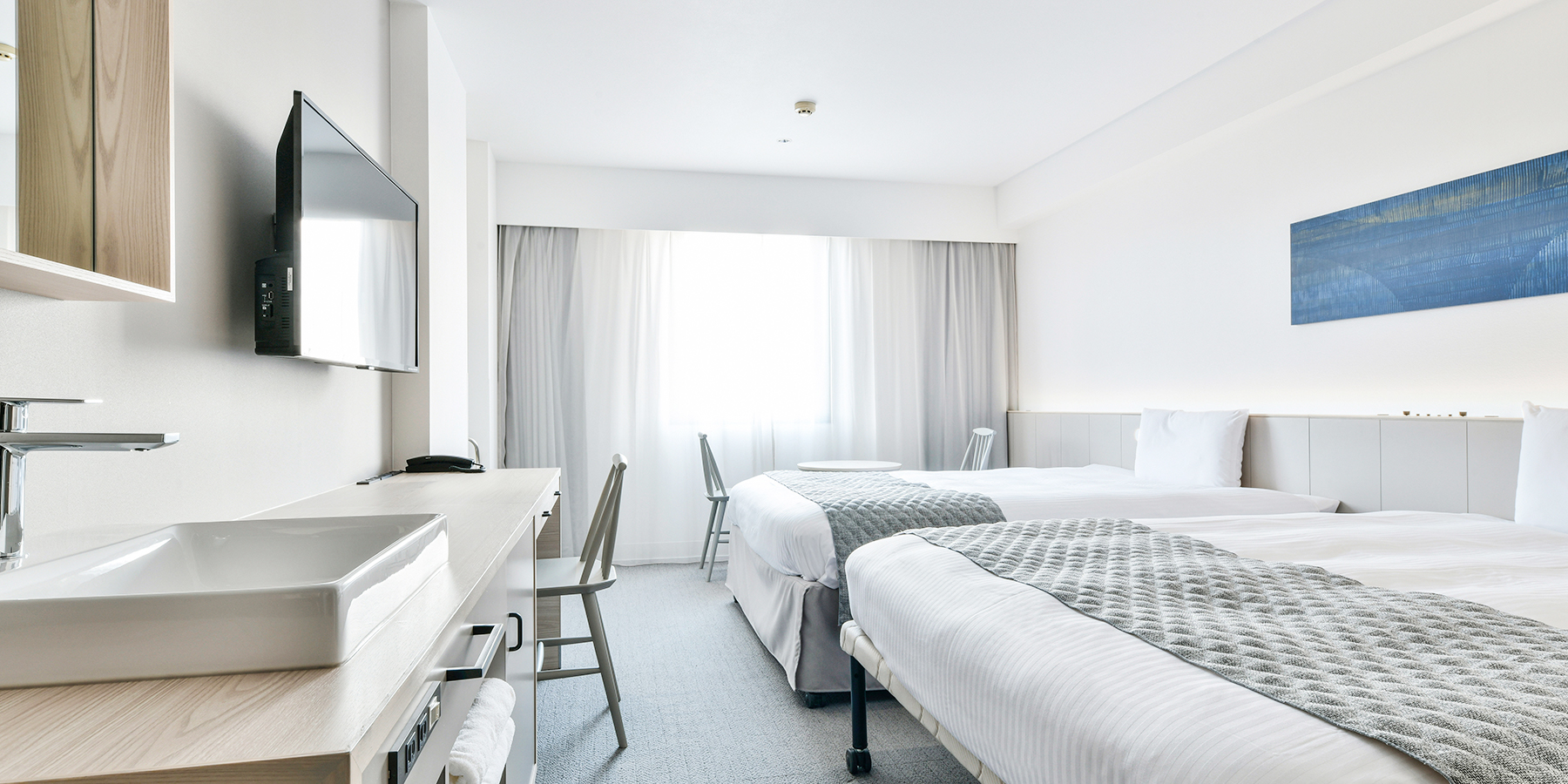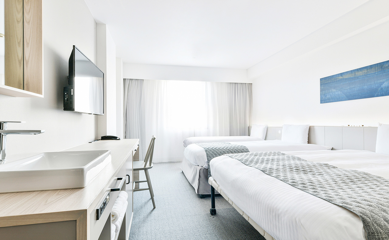 150cm幅のベッドと、90cm幅のベッドが2台設置の客室。洗面化粧台・バス・トイレがそれぞれ独立しており、快適にお過ごしいただけます。