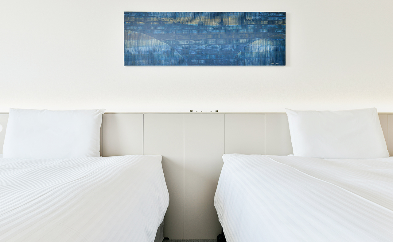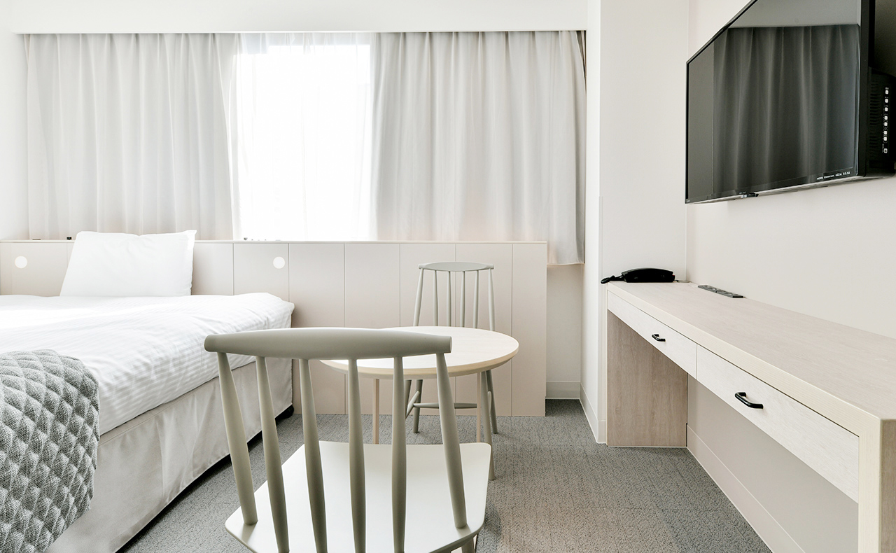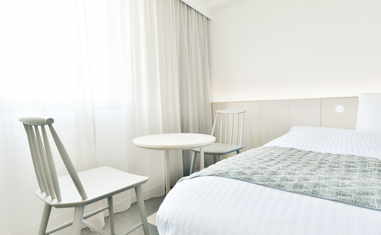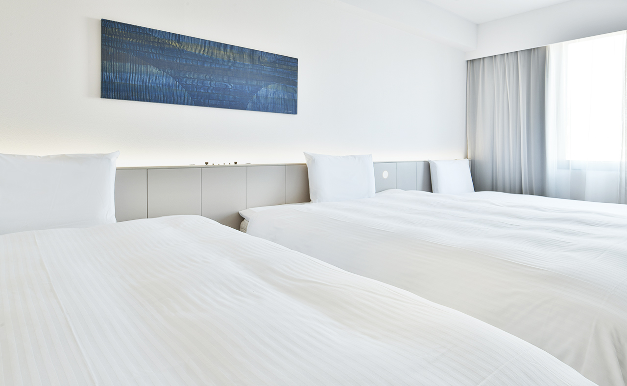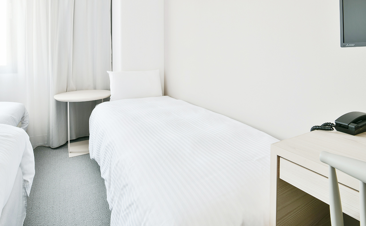 全室ベッド幅150cmのゆとりサイズを完備。客室はビジネスでもご家族でも満足の広さ。お部屋では靴を脱いで素足でくつろげます。