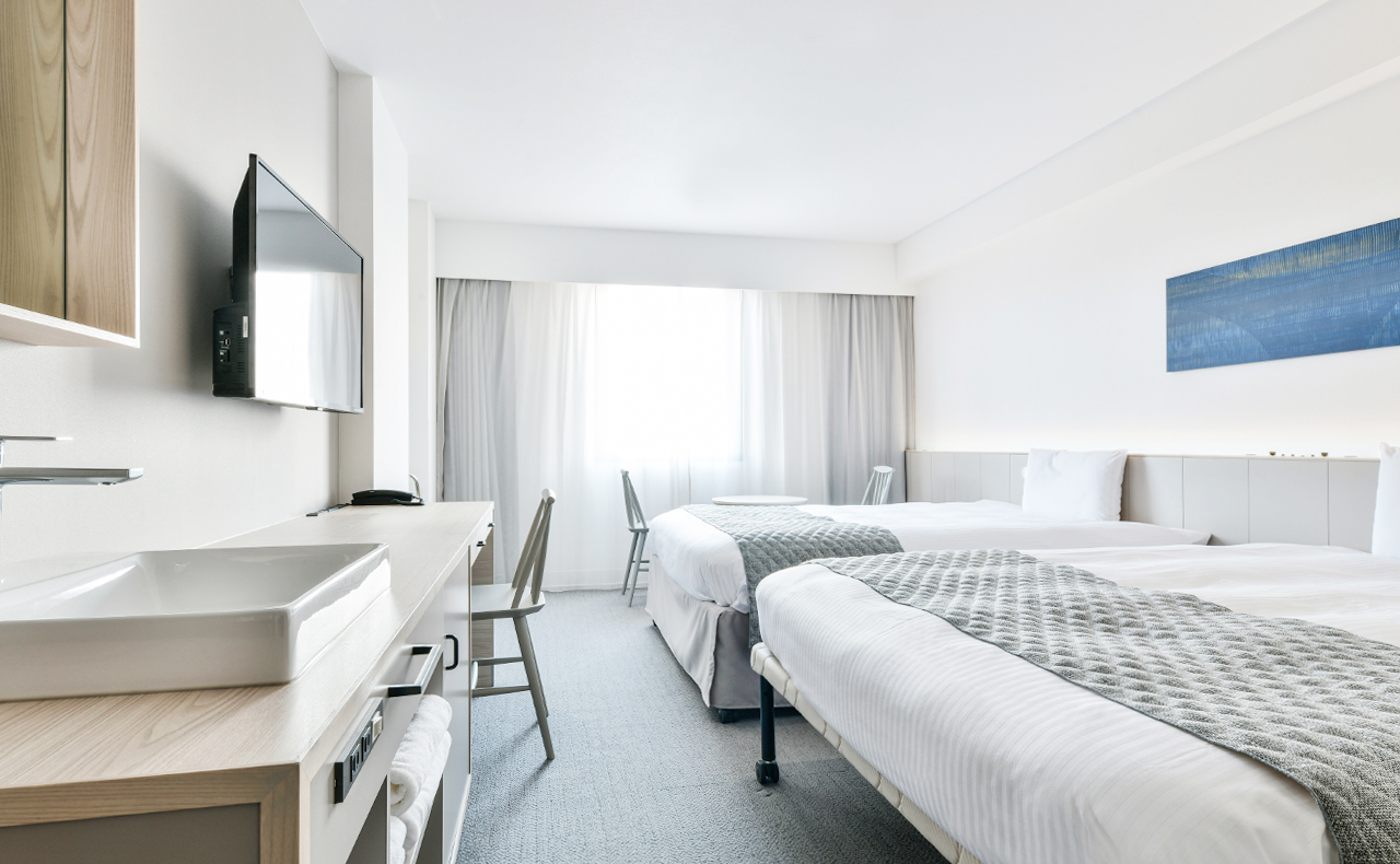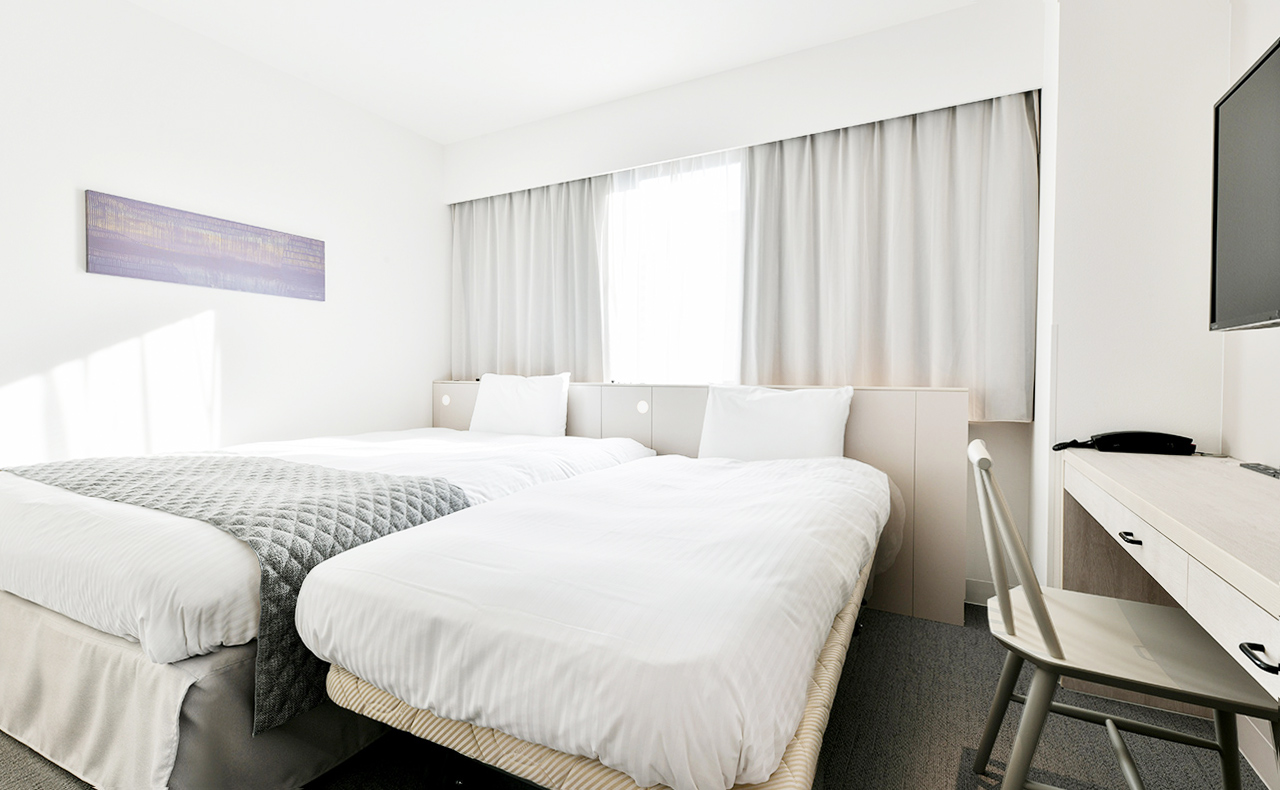 150cm幅ベッドのツインルームです。洗面化粧台・バス・トイレがそれぞれ独立しており、快適にお過ごしいただけます。
