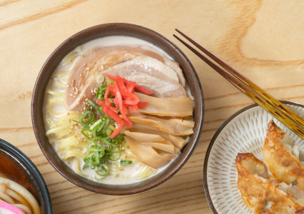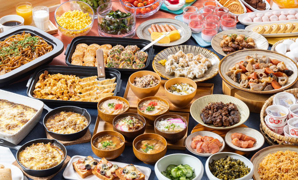 日替わりで楽しめる小倉鉄板焼きコーナーの「ホルモン焼き」や「餃子」、「薩摩野菜五目揚げ」などをご飯のお供にご当地味噌汁を組み合わせて、朝からしっかり食べて元気な一日のはじまりに!