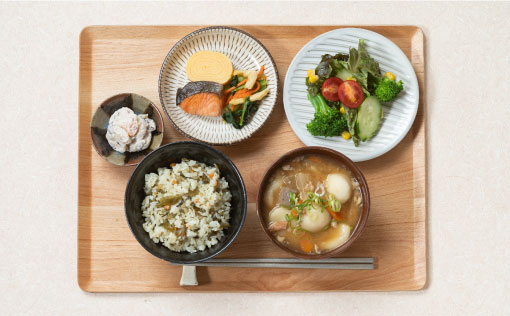 「高菜ごはん(日替わり)」や「だご汁(日替わり)」など定番のお惣菜に充実のサラダを添えて心と体に優しいヘルシーな一汁三菜朝ごはんでほっこりとした朝のひとときをお過ごしください。