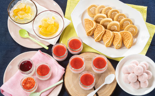 いちごの産地福岡をイメージした甘酸っぱい贅沢いちごソースと優しい甘さのミルクプリンがマッチしたいちごプリンや、小倉の老舗店のオムレットをイメージしたふわふわオムレット風ワッフルなど、オリジナルスイーツをお楽しみください。