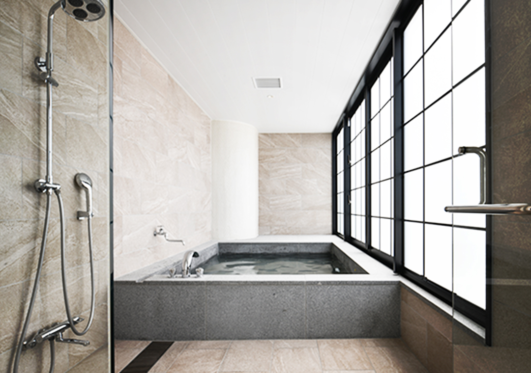 浴室には敷地内の源泉から天然温泉が引かれており、お部屋で温泉体験をお楽しみいただけます。プライベート空間で浸かる温泉は、旅の疲れを格別に優しくケアしてくれます。