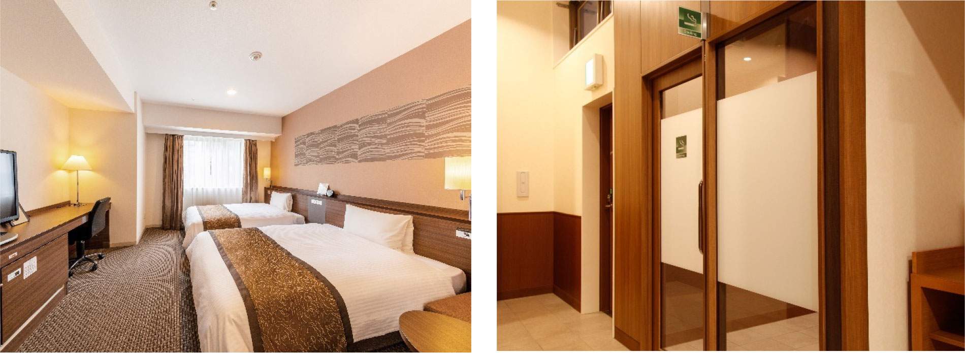 全客室禁煙に変更するにあたり、3フロア計54室の喫煙ルーム及び廊下のクロス張替え、クリーニングを実施いたしました。喫煙されるお客様のためには、24時間利用可能な喫煙ブースを設けております。