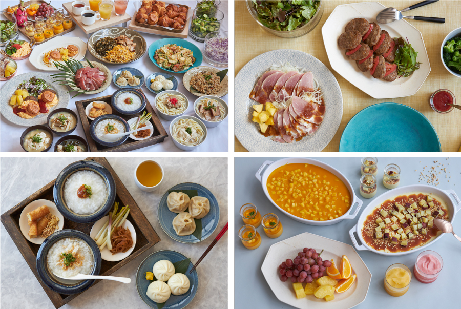 沖縄黒毛和牛とあぐー豚のハンバーグ、ホテル自家製スクランブルエッグ、スフレバンズ、ジューシー、イナムルドゥ―チー、沖縄そば、ゆし豆腐、島らっきょうの塩漬け、パパイヤ黒糖漬け、ゴーヤチャンプルー、沖縄かまぼこ、クーブイリチー、人参シリシリ、発酵美ら鶏粥、デザートフルーツ各種(レクー沖縄マンゴープリン、レクー沖縄安納芋のカタラーナ)、など。
