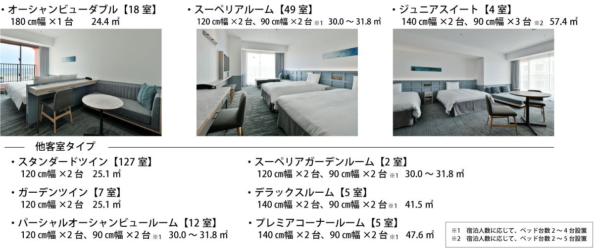 2階から7階までの客室フロアには、24.4~54.7㎡まで9タイプ229室のバリエーションに富んだ客室を設けており、全てのお部屋にバルコニーを設置しております。全室禁煙で空気洗浄機を完備。全館Wi-Fiも無料でご利用いただけます。