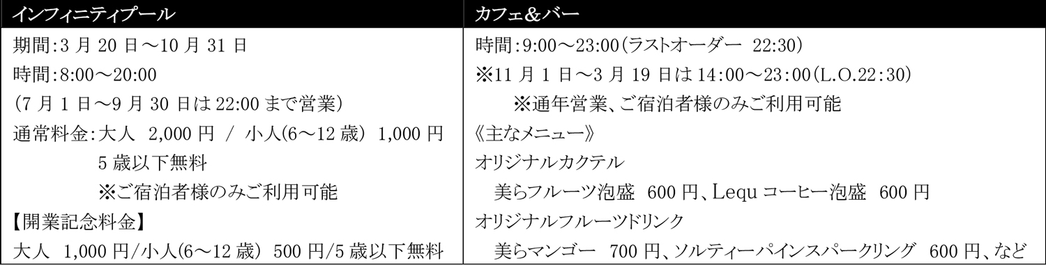 カフェ&バーでは、泡盛を使ったオリジナルカクテル「美らフルーツ泡盛」、「Lequコーヒー泡盛」やフルーツドリンク、軽食などを提供し、プールサイドでゆったりとしたひと時をお過ごしいただけます。夜は、プールもライトアップされ、落ち着いた雰囲気の中で、北谷の夜景を見下ろしながらお酒やオリジナルドリンクをお楽しみください。