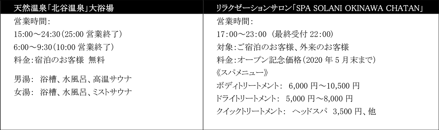 沖縄では大変珍しい1,400mの地下からくみ上げた天然温泉や、ハワイアンリラクゼーションサロン「SPA SOLANI OKINAWA CHATAN」によるアルガンオイルを使用したスパなどのコースも用意しております。