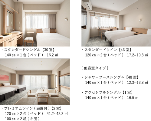2階から9階の客室フロアには、12.3 ㎡から 42.2 ㎡まで、全5タイプ124室の客室を設けております。木のぬくもりや香りを感じられる全室禁煙の客室で、やすらぎのひとときをお過ごしいただけます。