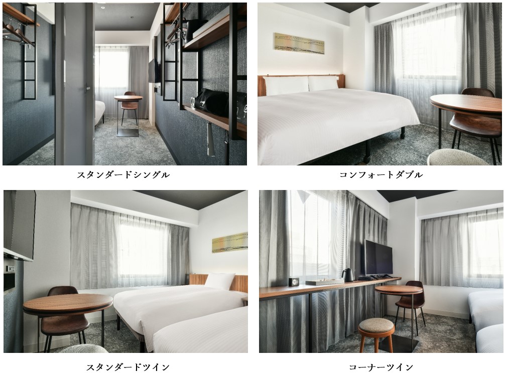 2階から14階の客室フロアには、13.7㎡から19.0㎡まで全5タイプ123室の客室を設けております。淡い色とシンプルな家具を組み合わせて、居心地の良い客室を提供いたします。全客室は禁煙で、Wi-Fiと有線LANを完備しております。HDMI接続が可能なテレビ、複数のデバイスの充電に便利な多数のコンセントなど、テレワークにも最適な空間となっております。