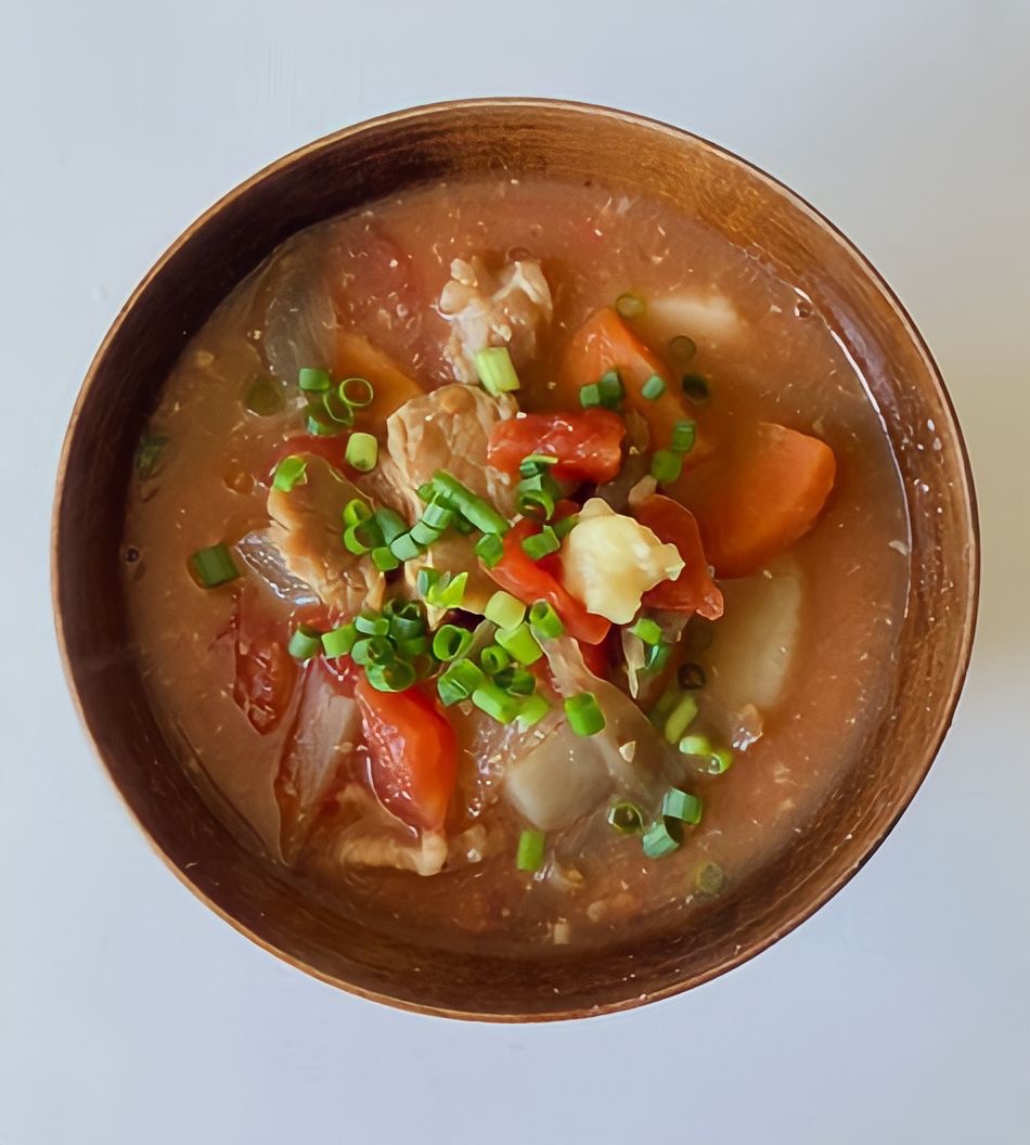 【生姜香るトマト豚汁】 トマトは抗酸化作用の強いビタミンが多く含まれており、赤い色素の「リコピン」は血液をサラサラにする効果が期待できます。豚肉のビタミンB1には疲労回復効果も期待できます。 |