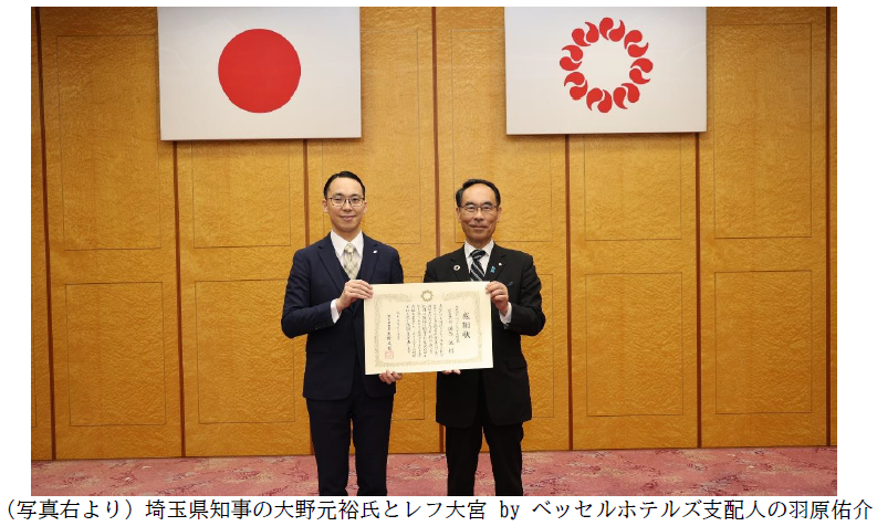 「あなたと家族と街を愛する。」をコンセプトに、全国でホテル事業を展開する株式会社ベッセルホテル開発(本社:広島県福山市南本庄三丁目4番27号、代表取締役社長:瀬尾 吉郎)は、この度埼玉県の大野元裕知事より感謝状を拝受いたしました。この感謝状は、新型コロナウイルスに感染した方のための宿泊療養施設の確保・運営に協力した施設及び患者搬送用の車両を貸与した企業に贈られました。