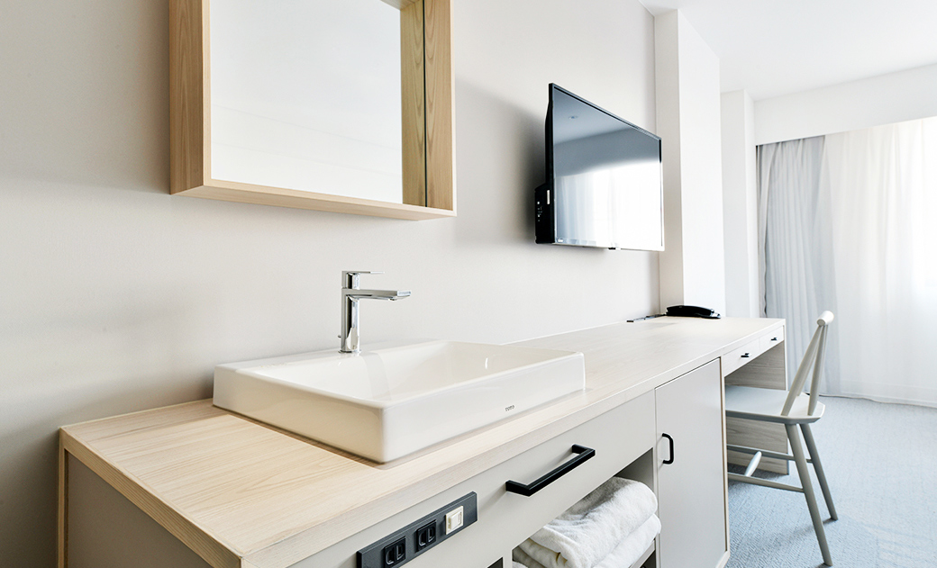 バスルームはアウトベイシンスタイルで、洗面化粧台が独立しています。お化粧等に非常に便利で、ご自宅のような感覚でご利用いただけます。