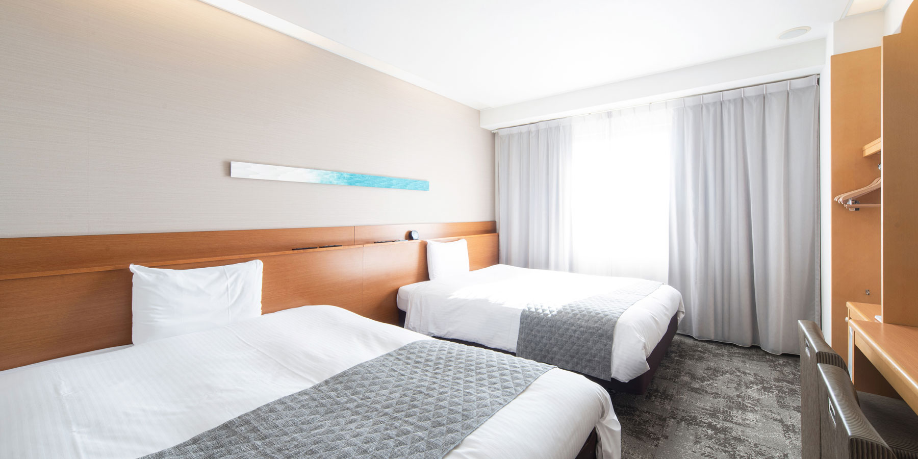 150cm幅ベッドのツインルームです。客室は26㎡でゆったりとした広さで、ご家族での宿泊も余裕です。