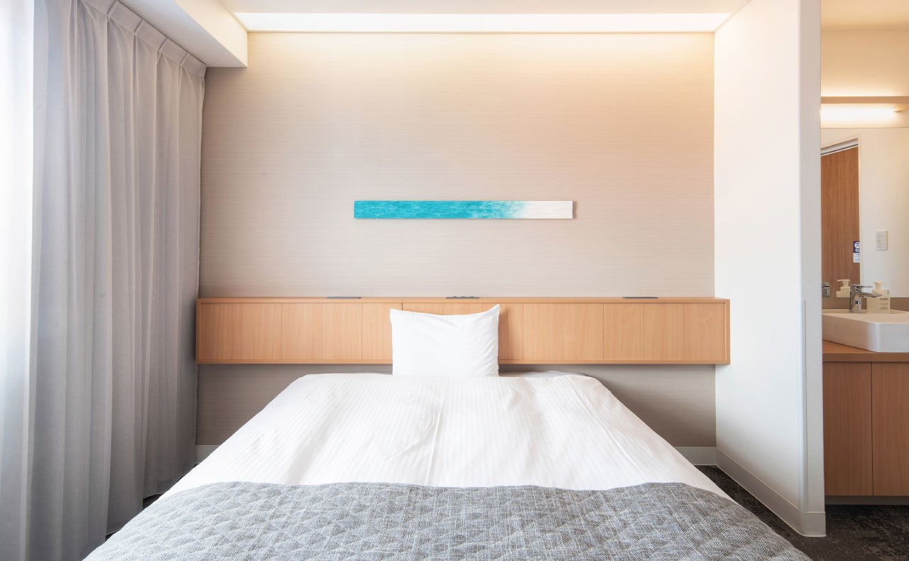 全室ベッド幅150cmのゆとりサイズを完備。客室はビジネスでもご家族でも満足の広さ。お部屋では靴を脱いで素足でくつろげます。